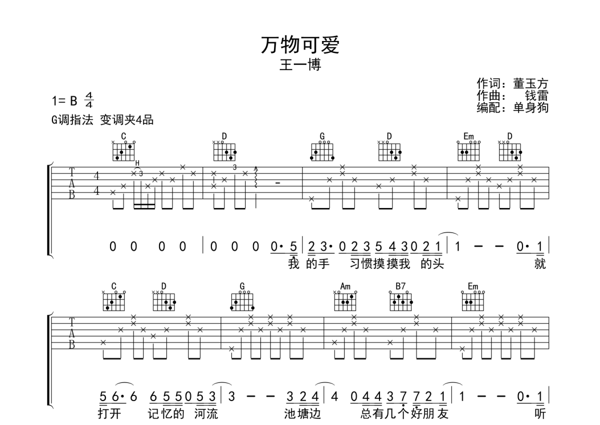 • 万物可爱吉他谱 - 王一博 - G调吉他弹唱谱第1张