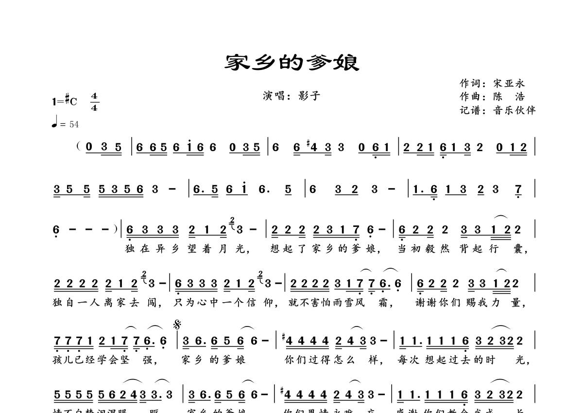 曲谱介绍: 影子《家乡的爹娘》,音乐伙伴编配出品,共有1张高清图谱,免翻页排版设计。