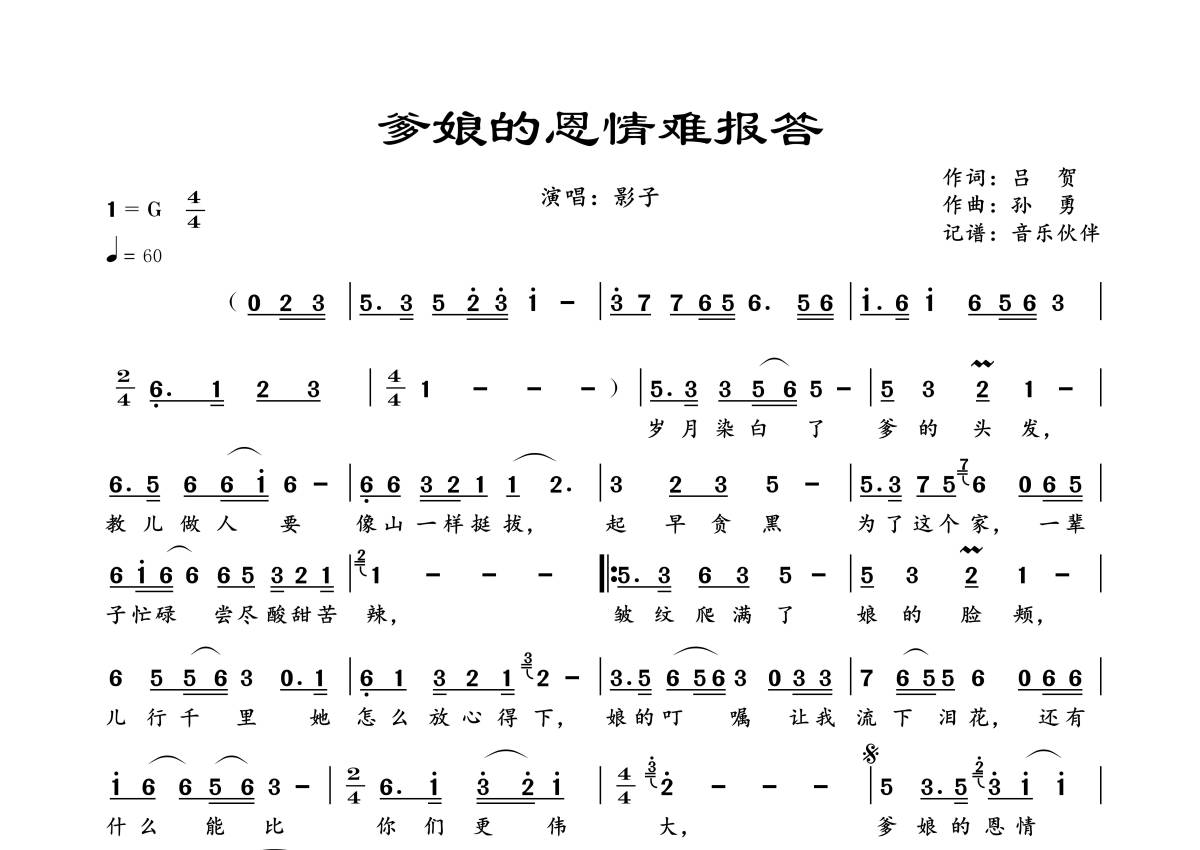 曲谱介绍: 影子《爹娘的恩情难报答》,音乐伙伴编配出品,共有1张高清图谱,免翻页排版设计。