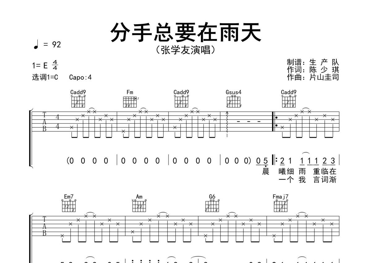 曲谱介绍: 张学友《分手总要在雨天》吉他弹唱谱,采用C调指法编配精编完美版,生产队编配出品,共有3张高清图谱。