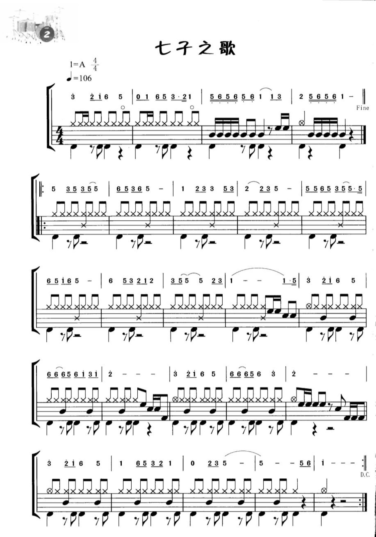 曲谱介绍: 七子之歌(架子鼓谱)