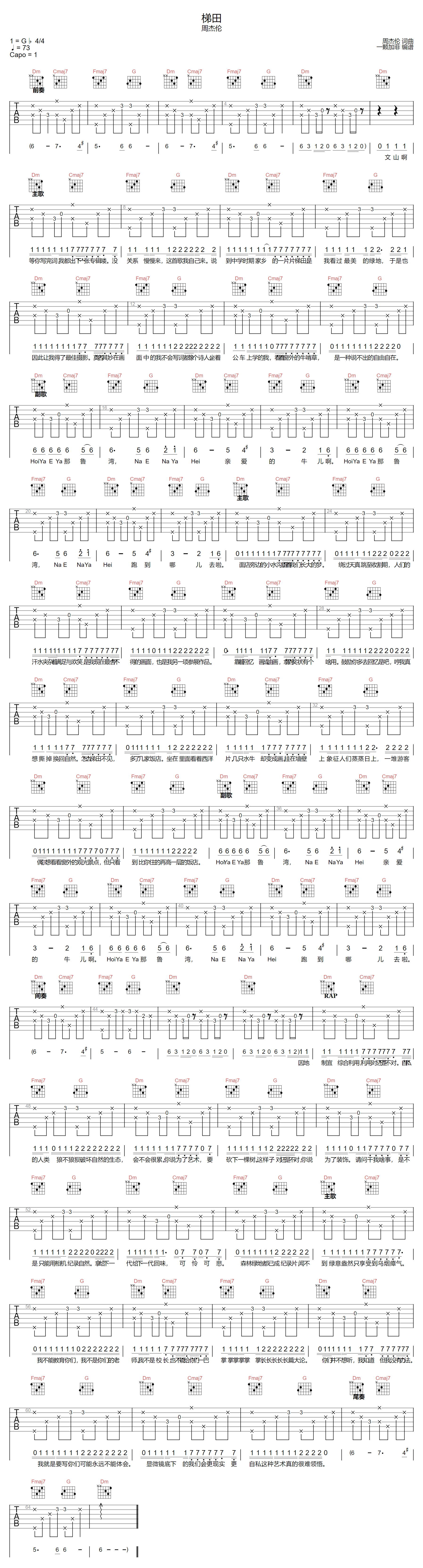 曲谱介绍: 周杰伦演唱的一首歌曲,4/4拍的节奏,这首歌曲的原调为#F调,这里曲谱采用了F调指法进行编配,演唱时夹变调夹1品可回到原调,也可根据个人实际嗓音情况选择。曲谱由琴谱网更新上传,来源于@一颗加菲编配出品。这首歌的主题是保护自然,在歌词里已经很明显地写了出来。并且随着周杰伦的歌声,我们自然而然地就会跟随他坐着公车上学,经过一片片梯田。整幅画面十分惬意、优美。