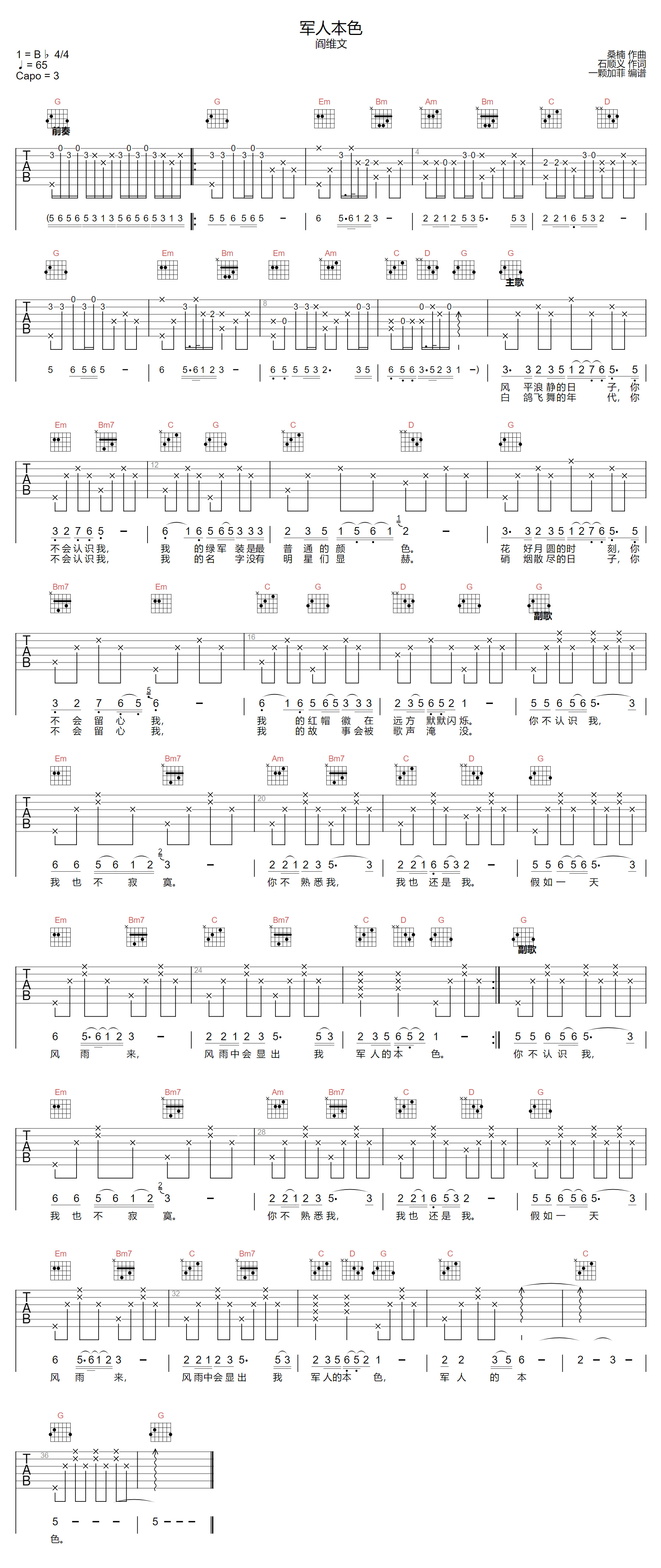 军人本色吉他谱 - 阎维文 - G调吉他弹唱谱 - 原版