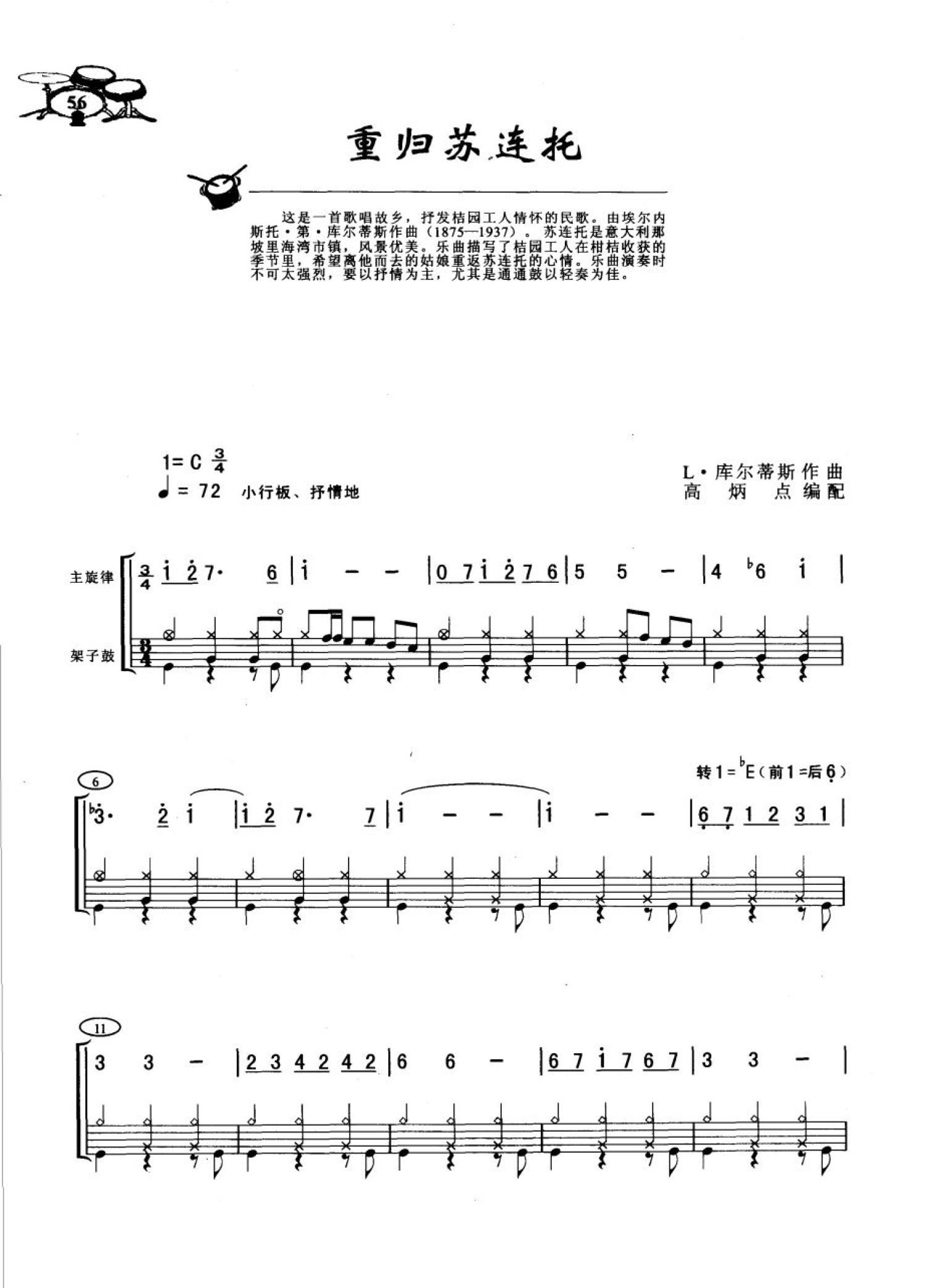 曲谱介绍: 重归苏连托(架子鼓谱)