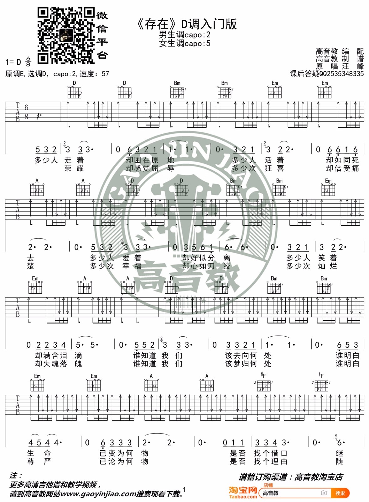 曲谱介绍: 汪峰演唱的一首歌曲,6/8拍的节奏,这首歌曲的原调为E调,这里曲谱采用了D调指法进行编配,演唱时夹变调夹2品可回到原调,也可根据个人实际嗓音情况选择。曲谱由琴谱网更新上传,来源于@高音教编配出品。这首《存在》,汪峰呐喊成曲,试图安慰奋斗的勇士;试图唤醒沉睡的心灵。汪峰认为,摇滚乐不仅仅是反叛不满,更代表了一种冲破窒碍的生命力。发问并在过程中找到答案,正是《存在》这首歌创作的动力。