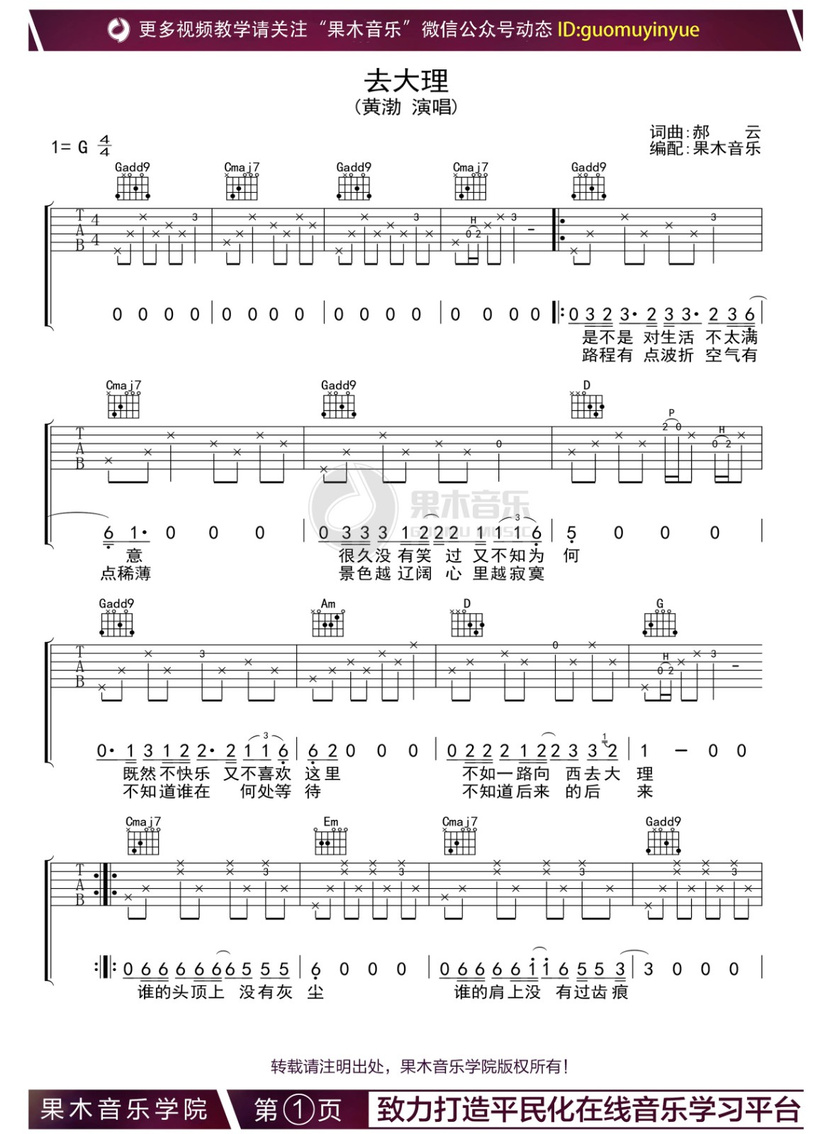 曲谱介绍: 《去大理》吉他谱,G调编配版吉他弹唱谱,来自果木音乐编配六线谱。吉他谱根据黄渤的演唱版编配,右手的伴奏节奏型难度一般,部分地方加入了击弦的指法,难度简单。 是不是对生活不太满意,我无数次梦想着去大理,这么多年却一直被赶着往前走。迷失,彷徨,迷茫充斥着生活,我像个傀儡完成着我每一个角色,岁月早已把梦想两个字磨得一干二净。可能任何选择,无论对的错的都有遗憾吧。
