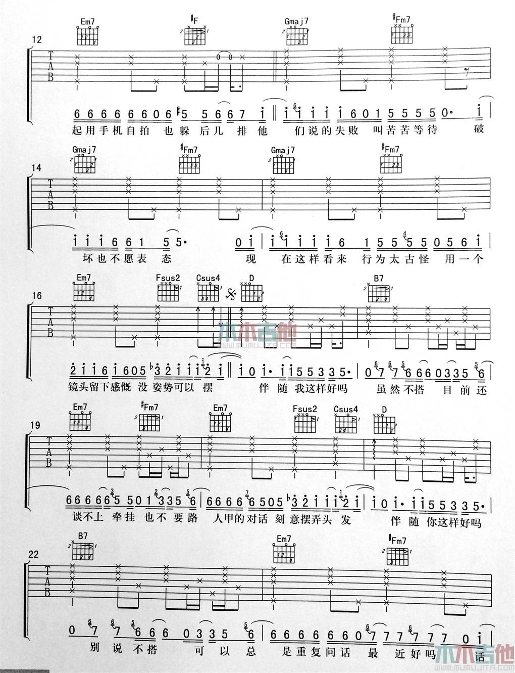 曲谱介绍: 李荣浩演唱的一首歌曲,4/4拍的节奏,这首歌曲的原调为降E调,这里曲谱采用了D调指法进行编配,演唱时夹变调夹1品可回到原调,也可根据个人实际嗓音情况选择。曲谱由琴谱网更新上传,曲谱来源于网络转载,编配制谱者暂不详。歌曲描述一对情侣在日常生活中,各方面习惯、相处的格格不入,但总是因为“爱”,能让两人在不搭的互动中继续走下去。