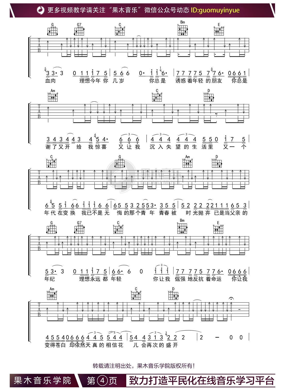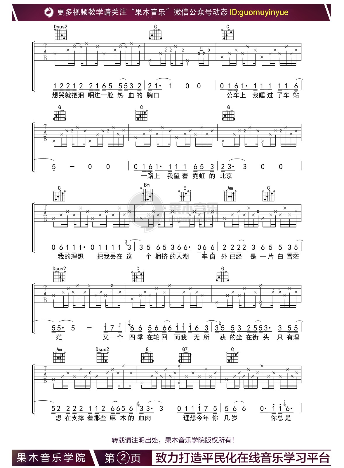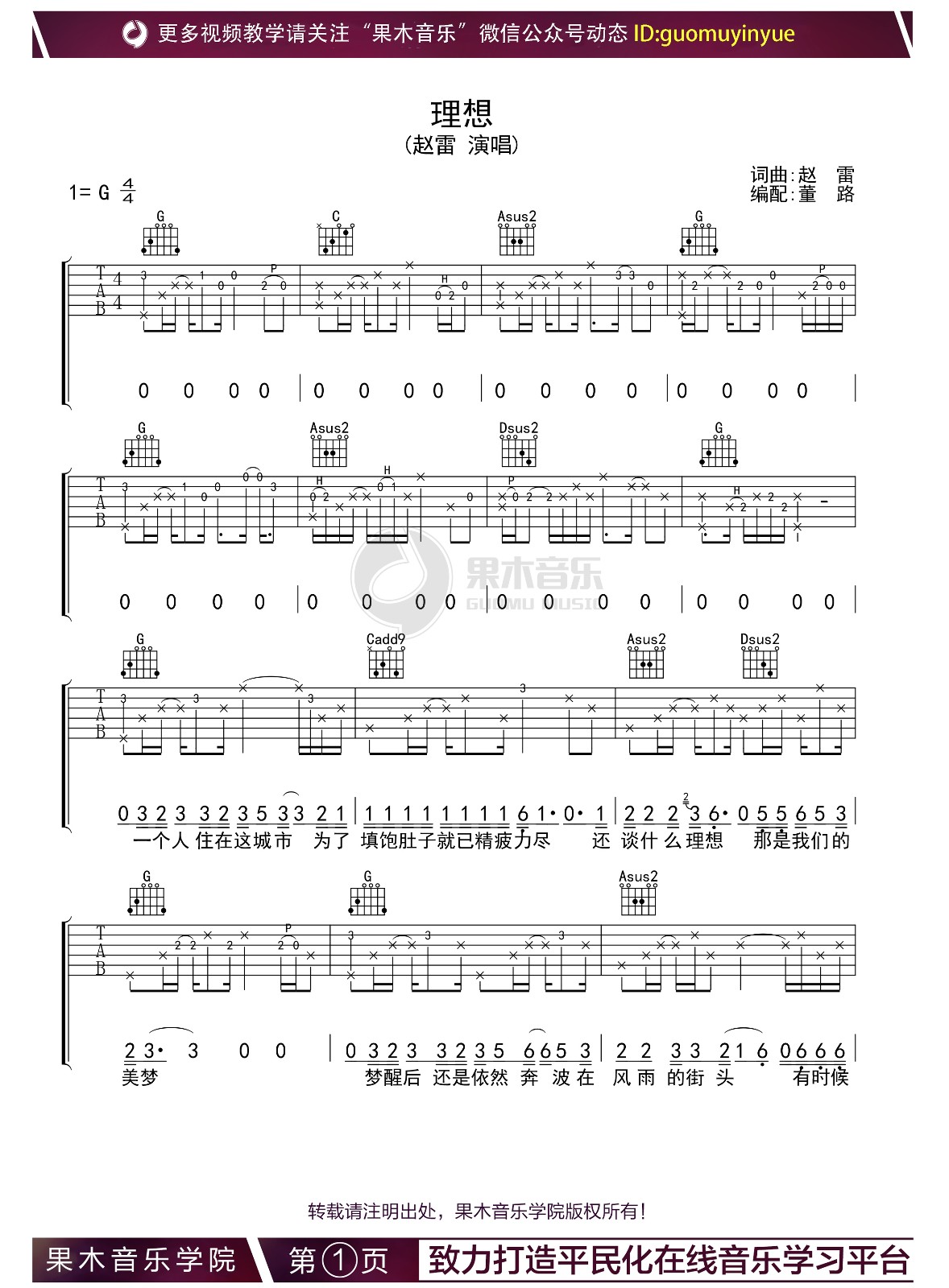 曲谱介绍: 赵雷《理想》,曾几何时,我们也把理想挂在嘴边,可随着年龄的增长,越来越多人开始回避这个词。对大多数人来说,理想,早已被现实磨平了棱角。可有的人,依然在为理想拼尽全力,人不怕走在黑夜只怕心中没有阳光! 理想吉他谱,G调版吉他弹唱谱,来自果木老师编配。演奏一共用到十个和弦,平淡的旋律里插入一些击弦的技法,整体难度适中。 歌曲名称:理想演唱歌手:赵雷编配选调:1=G歌曲原调:1=G变调夹:按需选择所用和弦:G、C、Asus2、Dsus2、Cadd9、Bm、E、Am、G7、D曲谱类型:弹唱六线谱演奏速度:80拍每分钟演奏视频:暂无图谱数量:共 5 张制谱编配:果木音乐演奏难度: