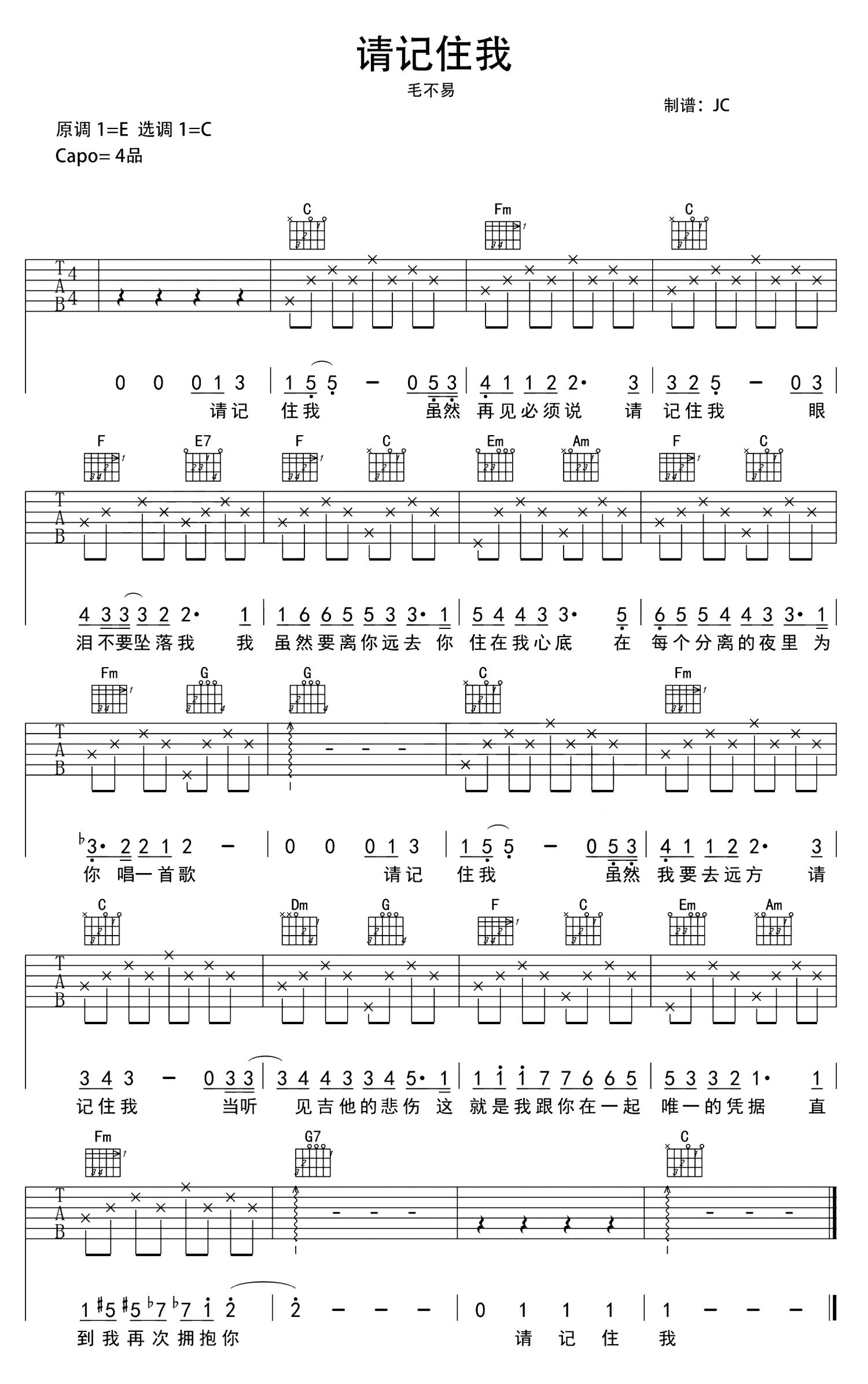 曲谱介绍: 请记住我吉他谱,毛不易演唱,动画电影《寻梦环游记》主题曲中文版。请记住我六线谱,原调E,选调C,变调夹夹四品。一首催泪的温暖歌曲,动听悦耳的旋律、缓缓流淌的温情的歌声,人生的终点不是死亡,而是遗忘。在爱的记忆消失前,请记得我。愿我们在追梦的路上不要忘记我们的家人。