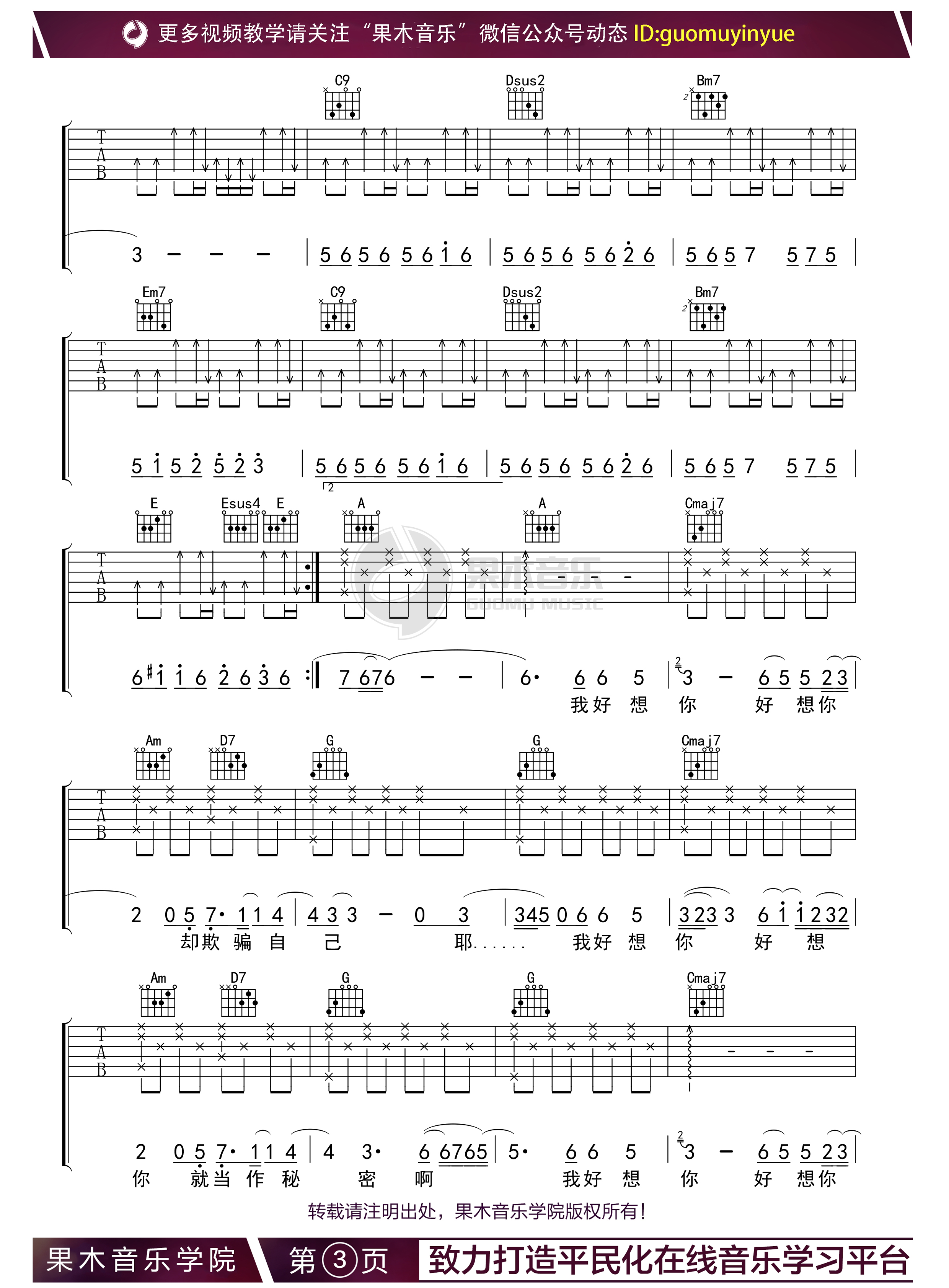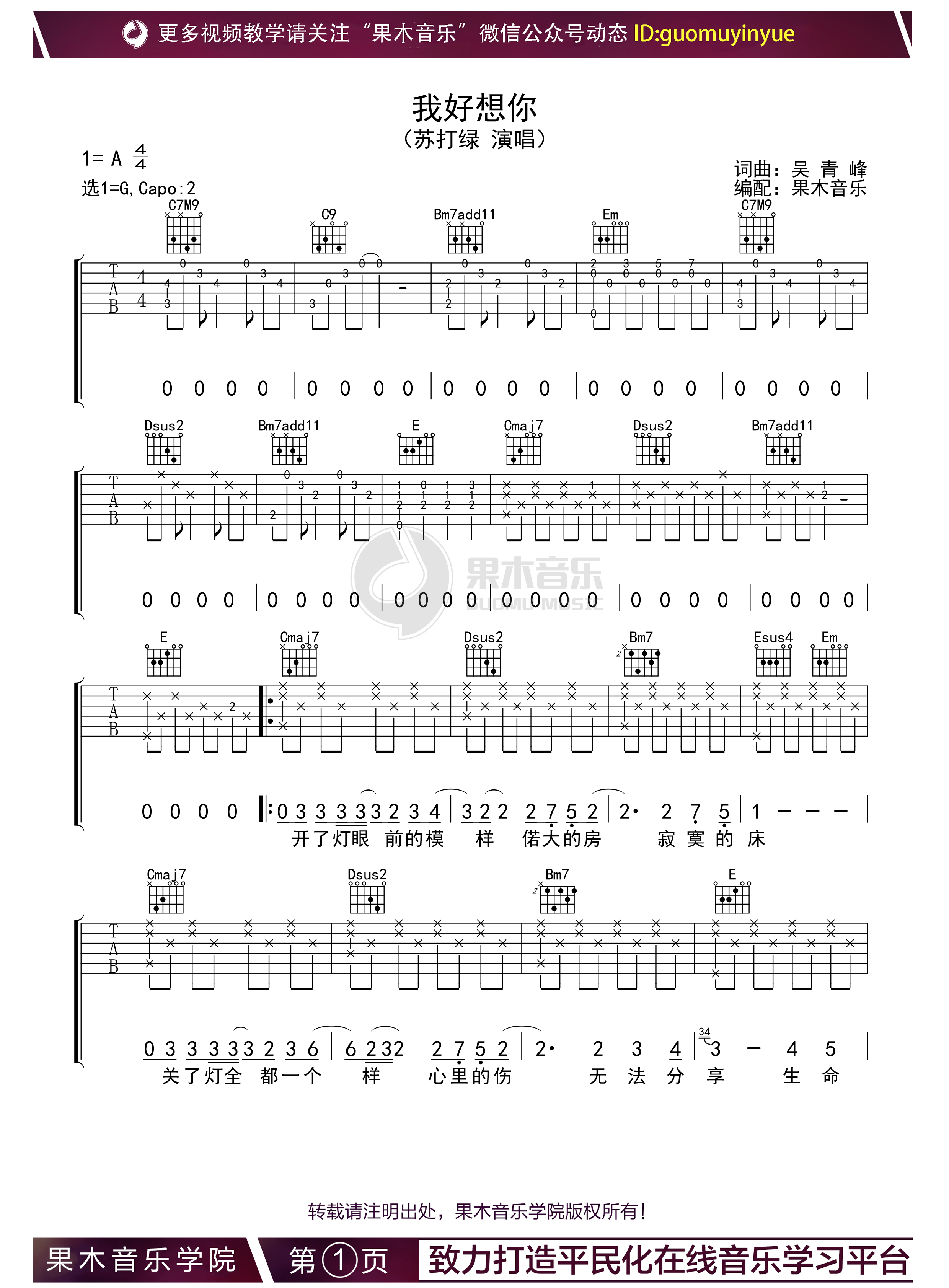曲谱介绍: 苏打绿《我好想你》,旋律简单而优美,充满温情和惆怅。我们总是在某个时刻闪回到从前的时光,虽然无法回到过去,但那些美好的回忆和深刻的情感,会一直陪伴我们。 歌曲名称:我好想你演唱歌手:苏打绿编配选调:1=G歌曲原调:1=A变调夹:第二品所用和弦:C7M9、C9、Bm7add11、Em、Dsus2、E、Cmaj7、Bm7、Esus4、D/C、Am、D、G、Em7/D、A曲谱类型:弹唱六线谱演奏速度:72拍每分钟图谱数量:共 4 张制谱编配:果木音乐演奏难度: 我好想你吉他谱,G调编配版吉他六线谱,来自果木老师编配版,高清六线谱格式,共四张谱例。本首歌用到的和弦较多,有很多不常用的扩展和弦,不过指法难度都不大。右手的节奏变化不大,大家演奏要注意左手换弦的准确度。 教程可参考: 我好想你吉他谱_吴青峰_G调编配版弹唱吉他谱附教程大树音乐 · 551 次浏览