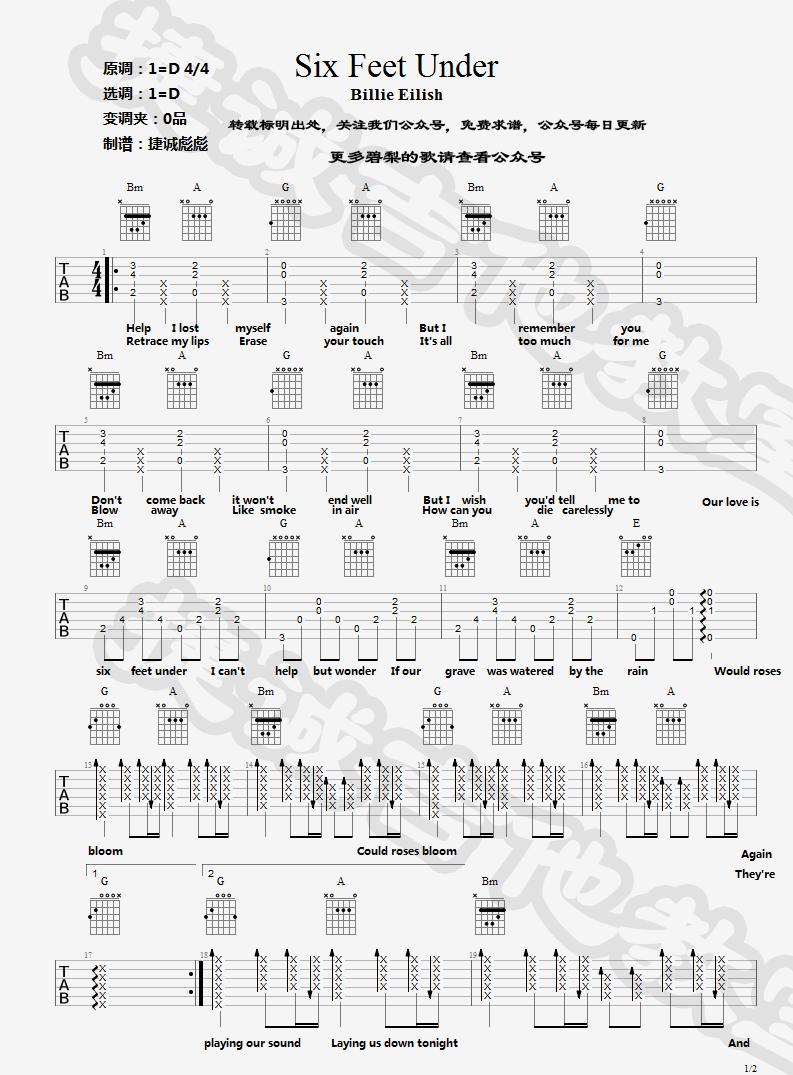 曲谱介绍: Billie-Eilish演唱的一首歌曲,4/4拍的节奏,这首歌曲的原调为D调,这里曲谱采用了D调指法进行编配,演唱时可不夹变调夹,曲谱由琴谱网更新上传,来源于@捷诚吉他教室编配出品。听着这首歌,仿佛看到了一座静默的墓园。起初女孩在滂沱大雨里哭泣,后来只剩下弥散雾气里开着的玫瑰和青苔的味道。