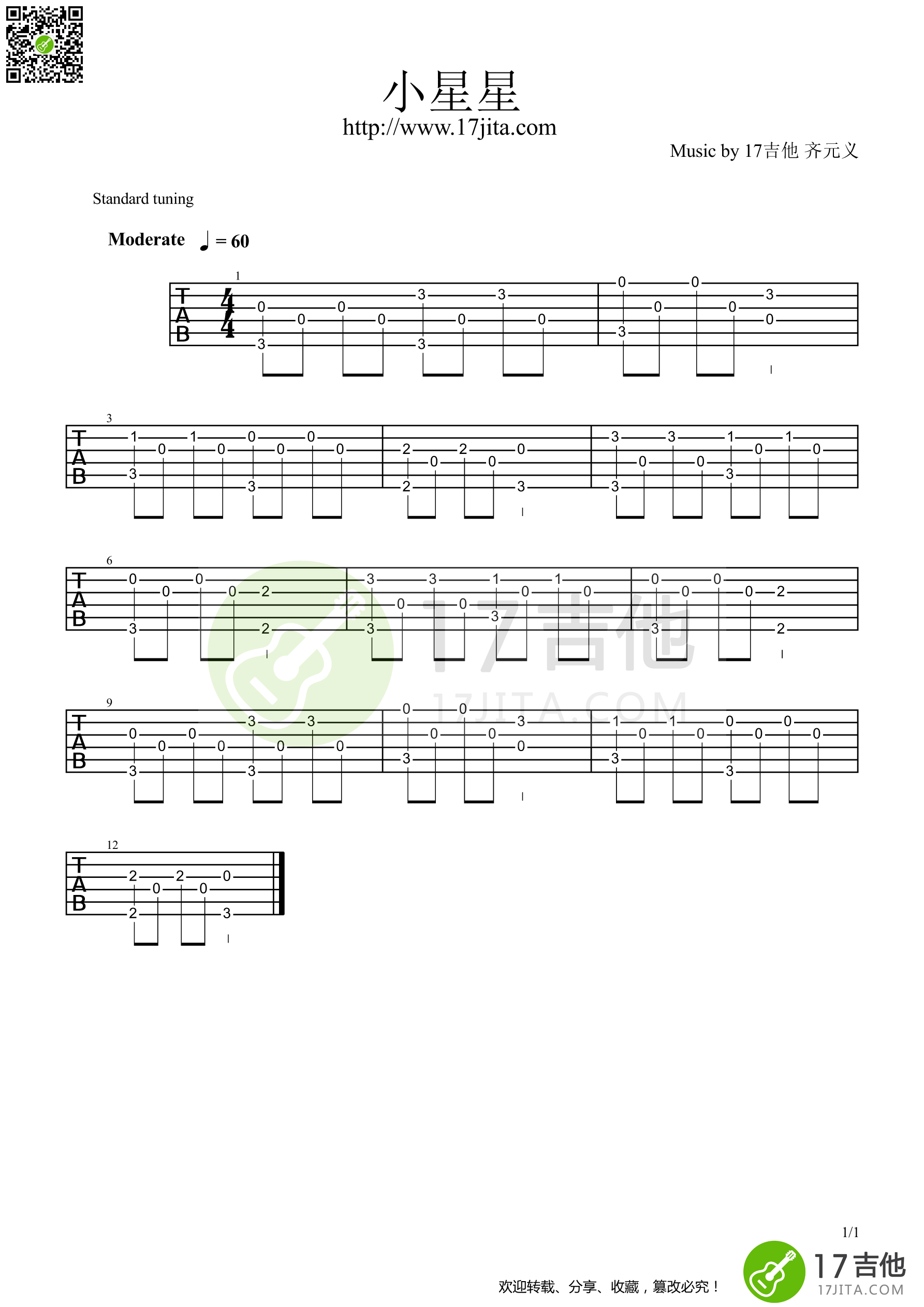 曲谱介绍: 这首曲子采用的是标准调弦,4/4拍的节奏,无需特殊调音。演奏时可不夹变调夹,曲谱由琴谱网更新上传,来源于@17吉他编配出品。一首很简单的小星星指弹吉他谱,基本上就是单音旋律加上根音的组合,篇幅也比较短,初学的时候用来练练手,在爬格子之余用来提升一下练习兴趣也是个不错的选择。