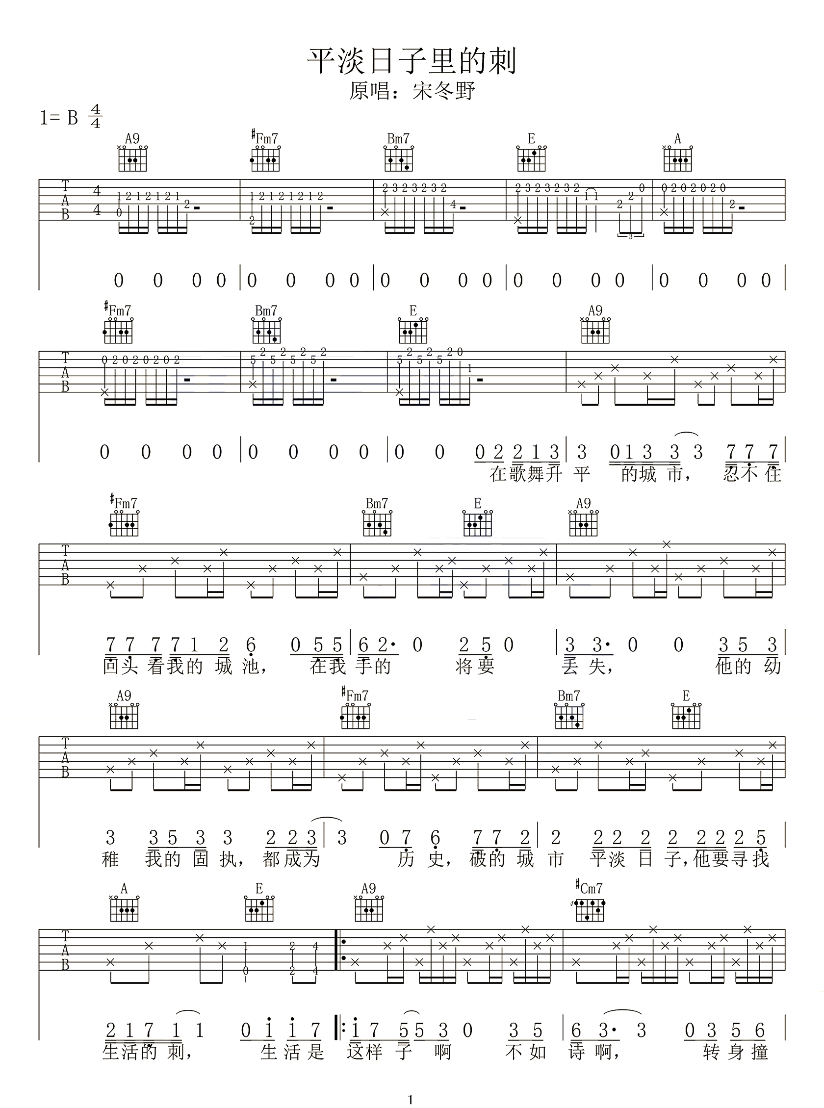 平淡日子里的刺吉他谱 - 宋冬野 - B调吉他弹唱谱 - 原版