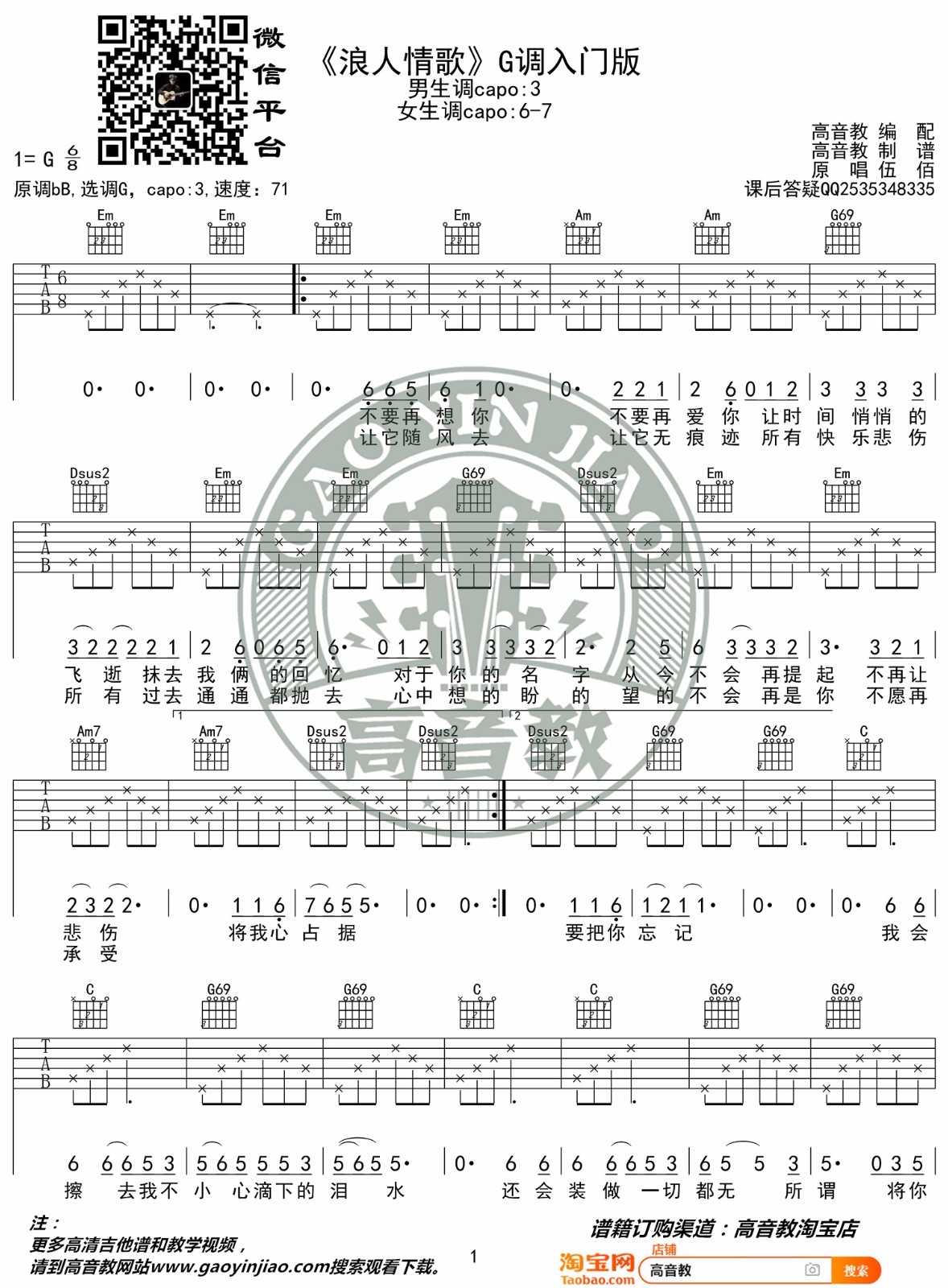 浪人情歌吉他谱 - 伍佰 - G调吉他弹唱谱