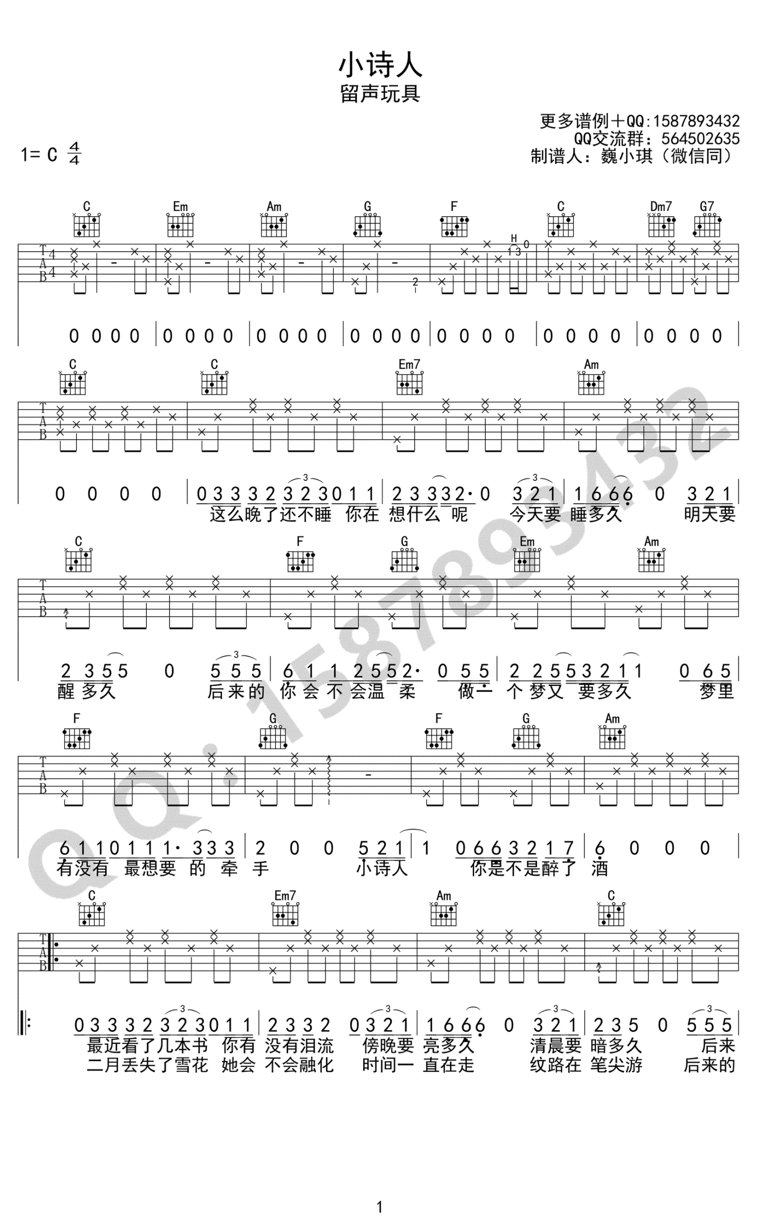 小诗人吉他谱 - 留声玩具 - C调吉他弹唱谱