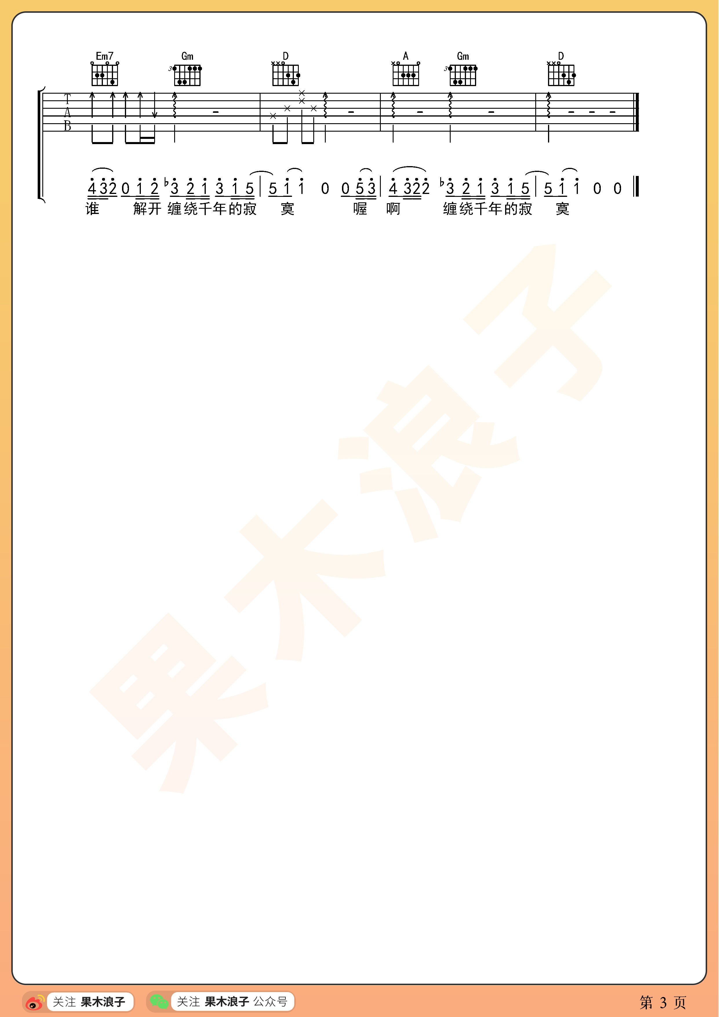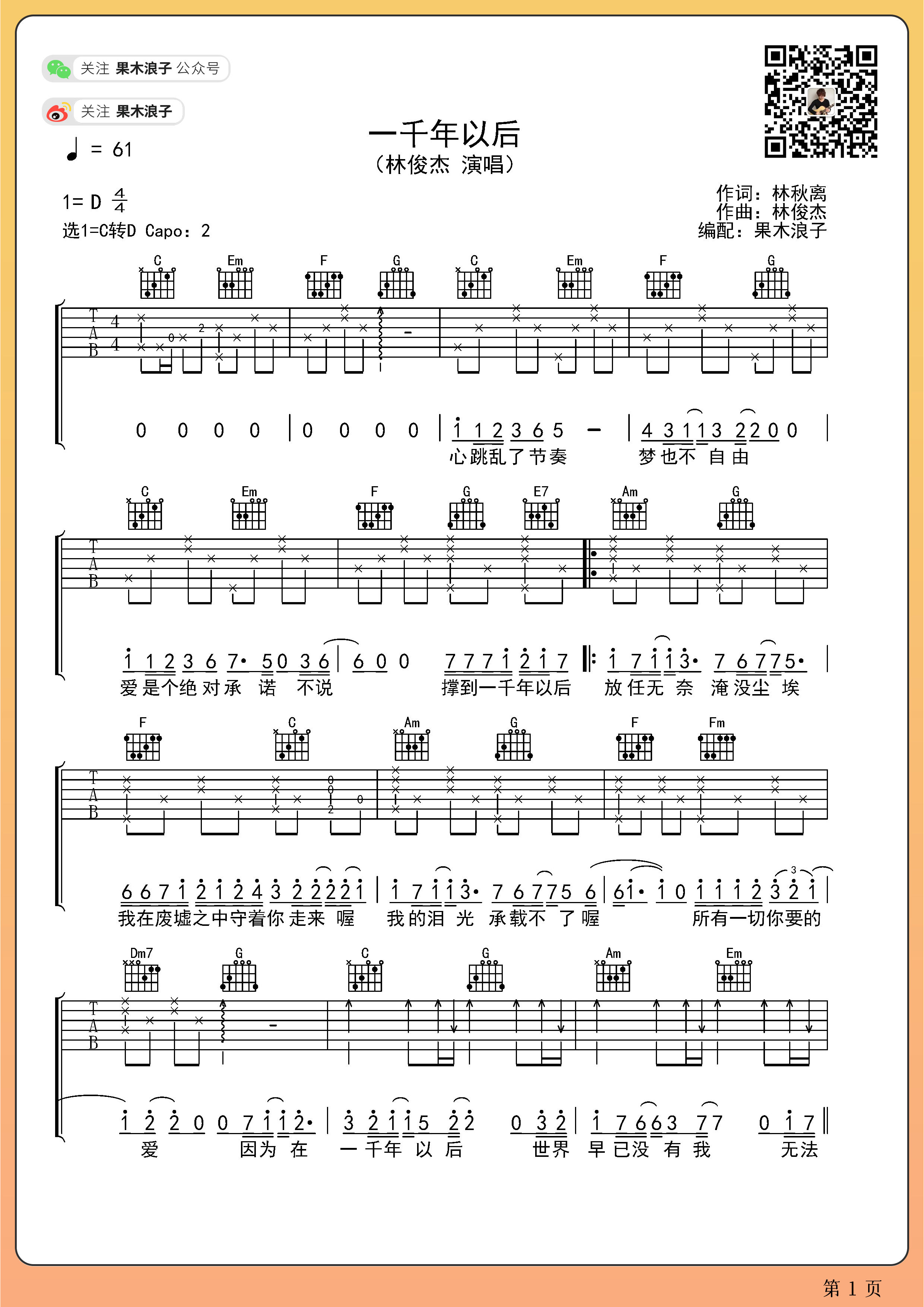 曲谱介绍: 一千年以后吉他谱,简单版吉他弹唱谱,来自果木浪子编配。这首歌编配的比较简单,为了照顾初学者做了简化处理,但是也编配了前奏。如果基本节奏没问题,大横按也突破了,可以拿这首歌练习一下。林俊杰《一千年以后》,他的情歌悲伤时治愈,快乐时温暖。这首老歌这么多年听来依然有着缠绵悱恻的深情,动人心弦。一千年以后,我们都将在哪里呢?早就化作尘埃,那时候已经没有我们“无法深情挽着你的手,浅吻你额头”。加上JJ的转音真是撩到心里了,勾起了多少人的爱情幻想。