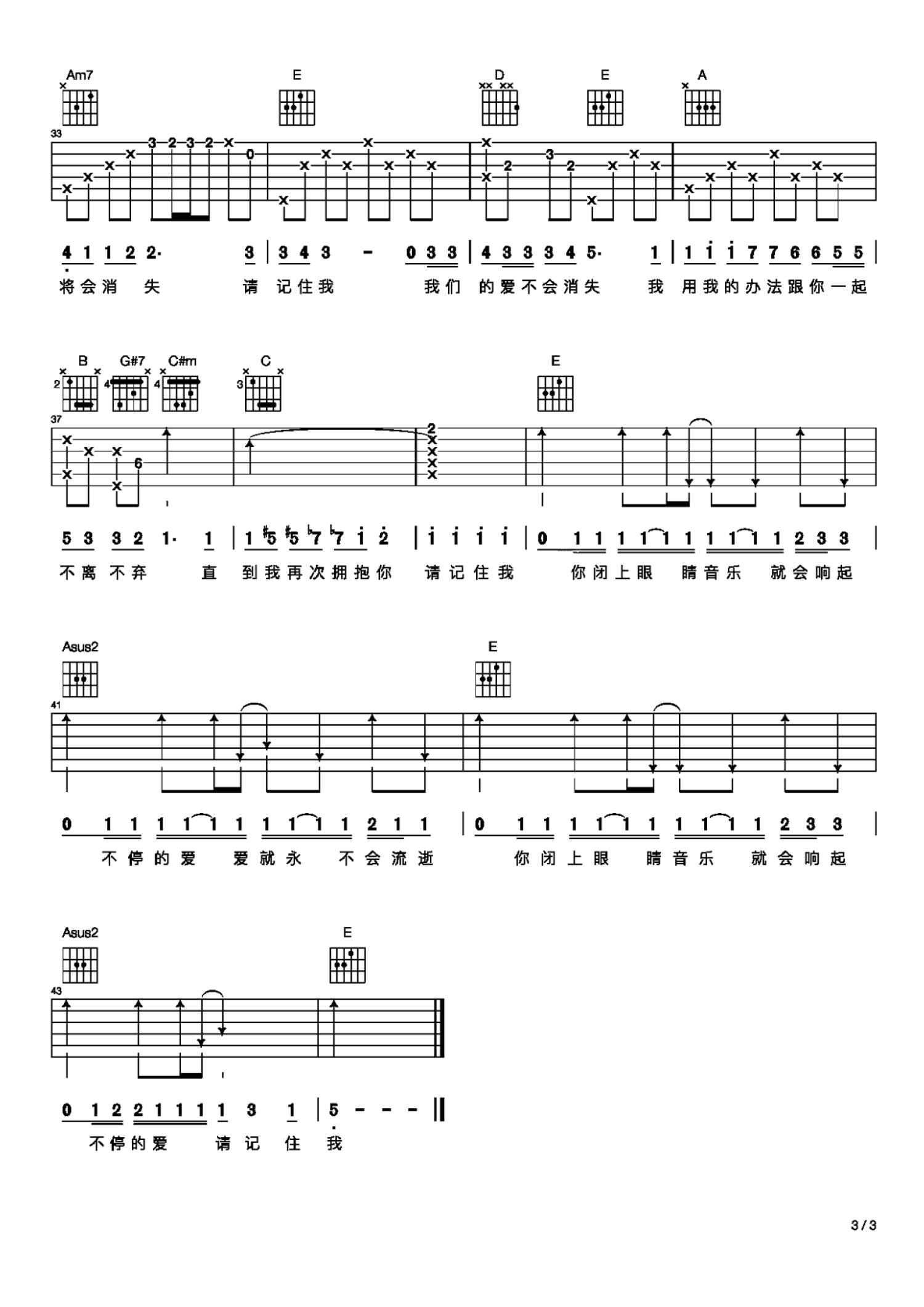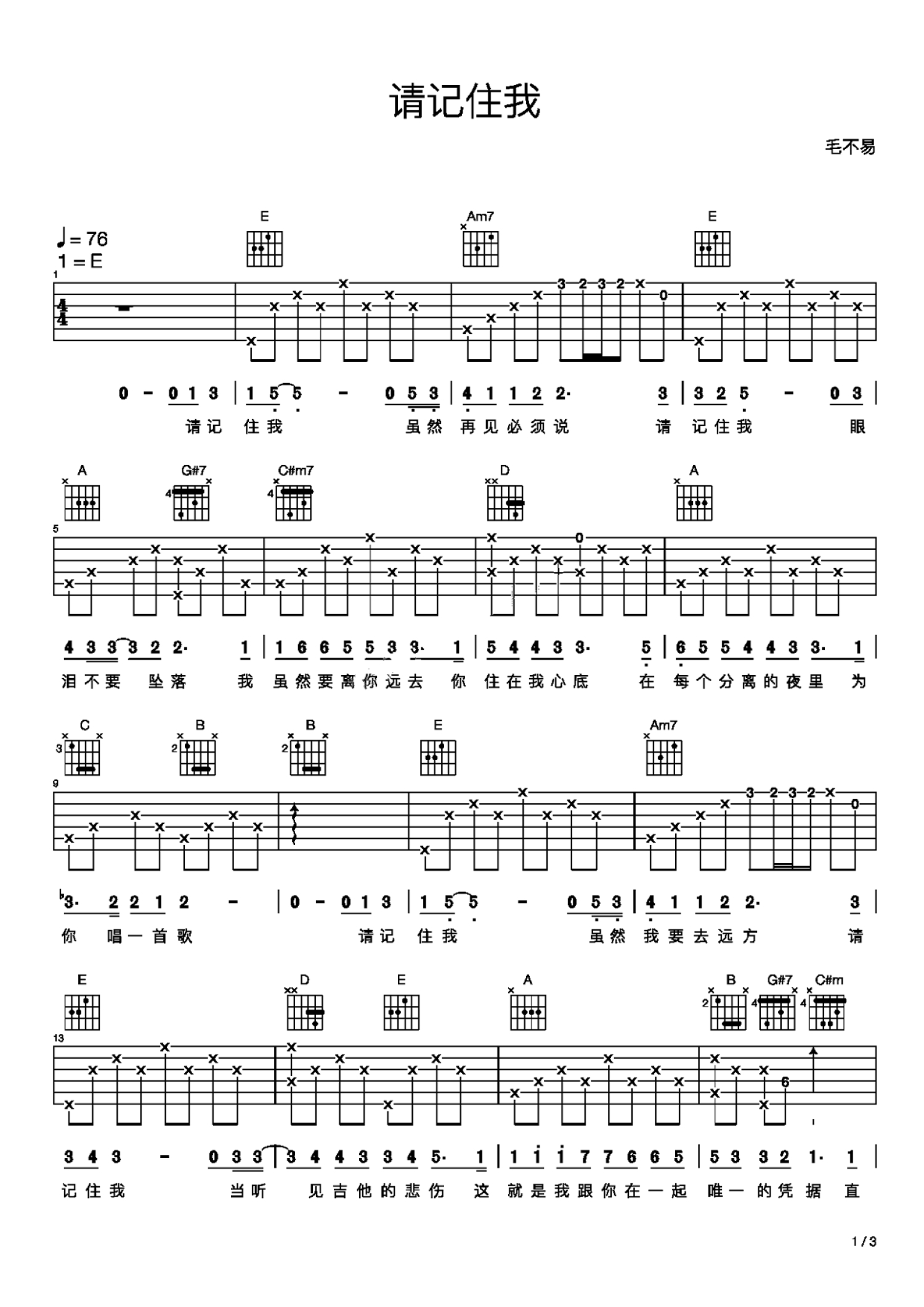 曲谱介绍: 请记住我吉他谱,毛不易献唱电影《寻梦环游记》中文主题曲,这是一首唱离别的歌,动人的旋律真挚的歌词将影片爱和亲情的主题温情唱出。巨星毛不易独特的音色似乎带着特有的感动,让人第一句就忍不住沉浸其中。爱的对立面不是恨,生的对立面也不是死。世间最可怕的事情,就是被自己爱的人忘记。“在爱的记忆消失前,请记住我”