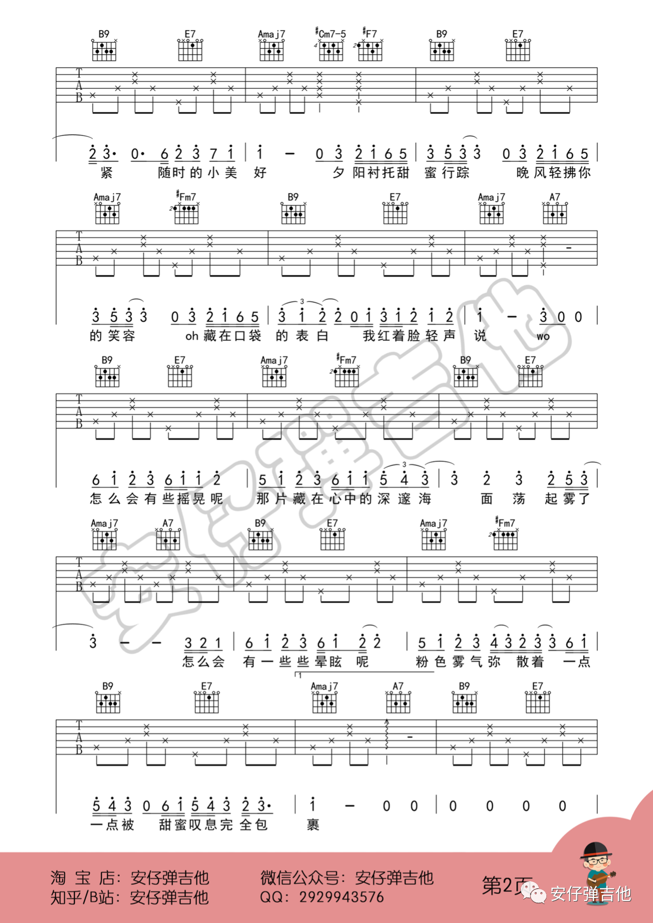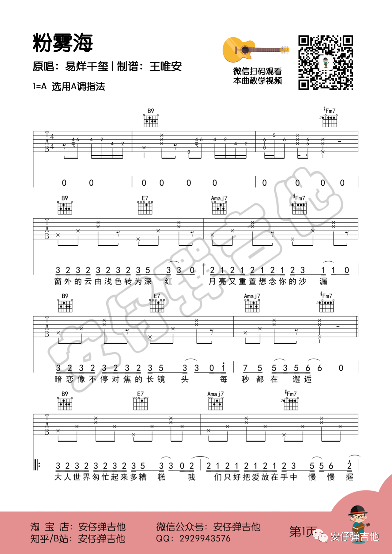 曲谱介绍: 粉雾海吉他谱,A调版吉他弹唱六线谱,易烊千玺演唱的一首歌,来自王唯安老师编配吉他六线谱,附演示教学视频。这首歌总的来说就是四个和弦,但原曲中用了很多过度和弦和连接方式,比如在段落之间用251来做段落之间的连接听起来,挺高级。
