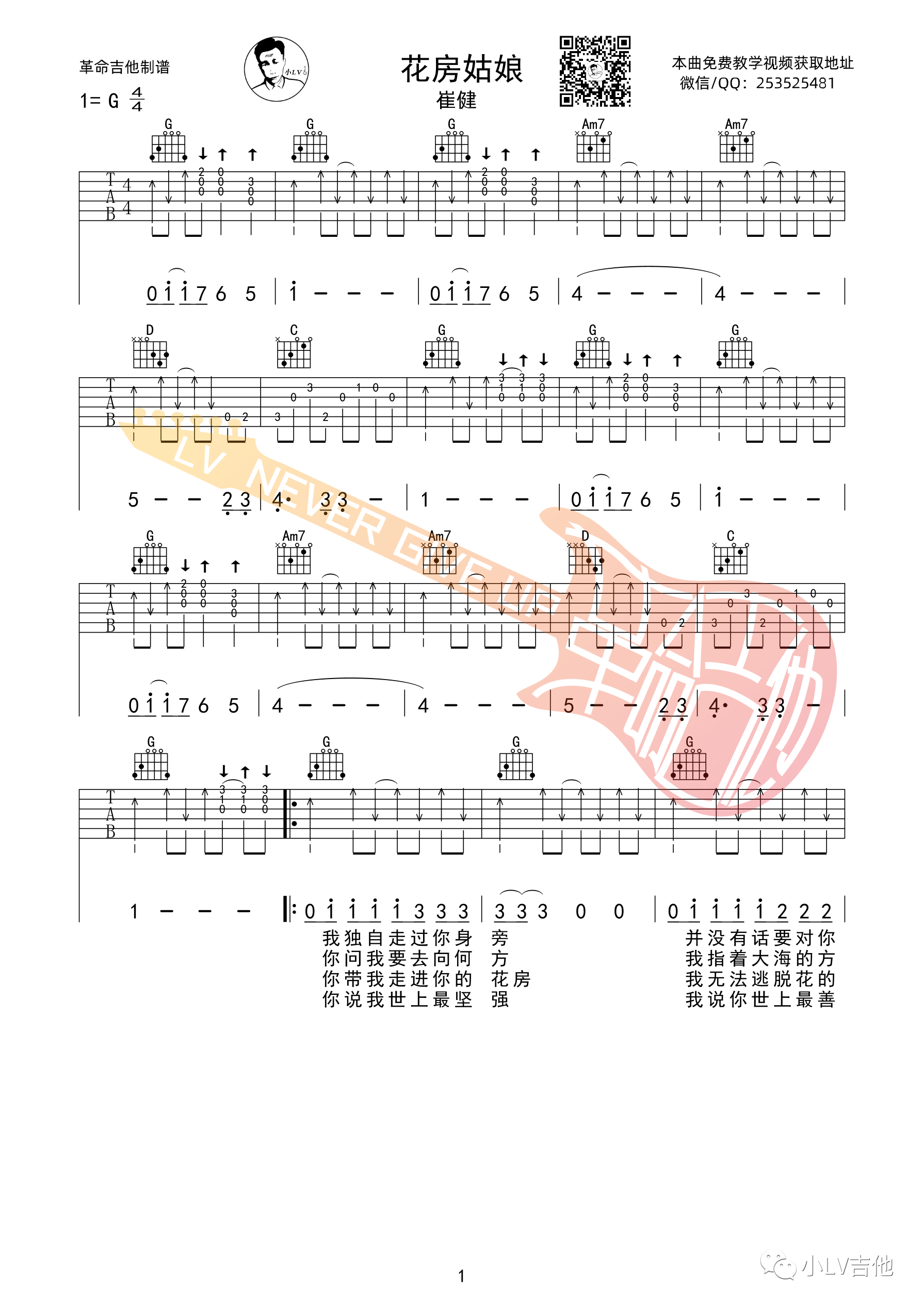 曲谱介绍: 崔健柔情歌曲《花房姑娘》,来自革命吉他教室编配弹唱谱,G调指法版,附教学演示教程。歌曲的演奏难度并不大,值得注意的是前奏扫弦要分出区域层次,不然不仅扫不出动听的旋律,还会有一种糊糊的感觉,建议大家认真观看教学视频。弹和唱的配合方面,着重注意整首曲子都是扫第一拍弦,在第一拍的后半拍(也就是完成第一下扫弦,抬手的时候)再开始唱,并不是扫弦的同时就张嘴唱出歌词。重点练习的地方个人建议对D和弦与C和弦单音部分加强练习,不仅要保证拨片弹奏的准确性,还要确保声音干净,并且节奏完整。如果是刚接触扫弦的小白要练习这首歌,可以先单独把吉他部分演奏熟练,最后再把歌词加进去进行弹唱。