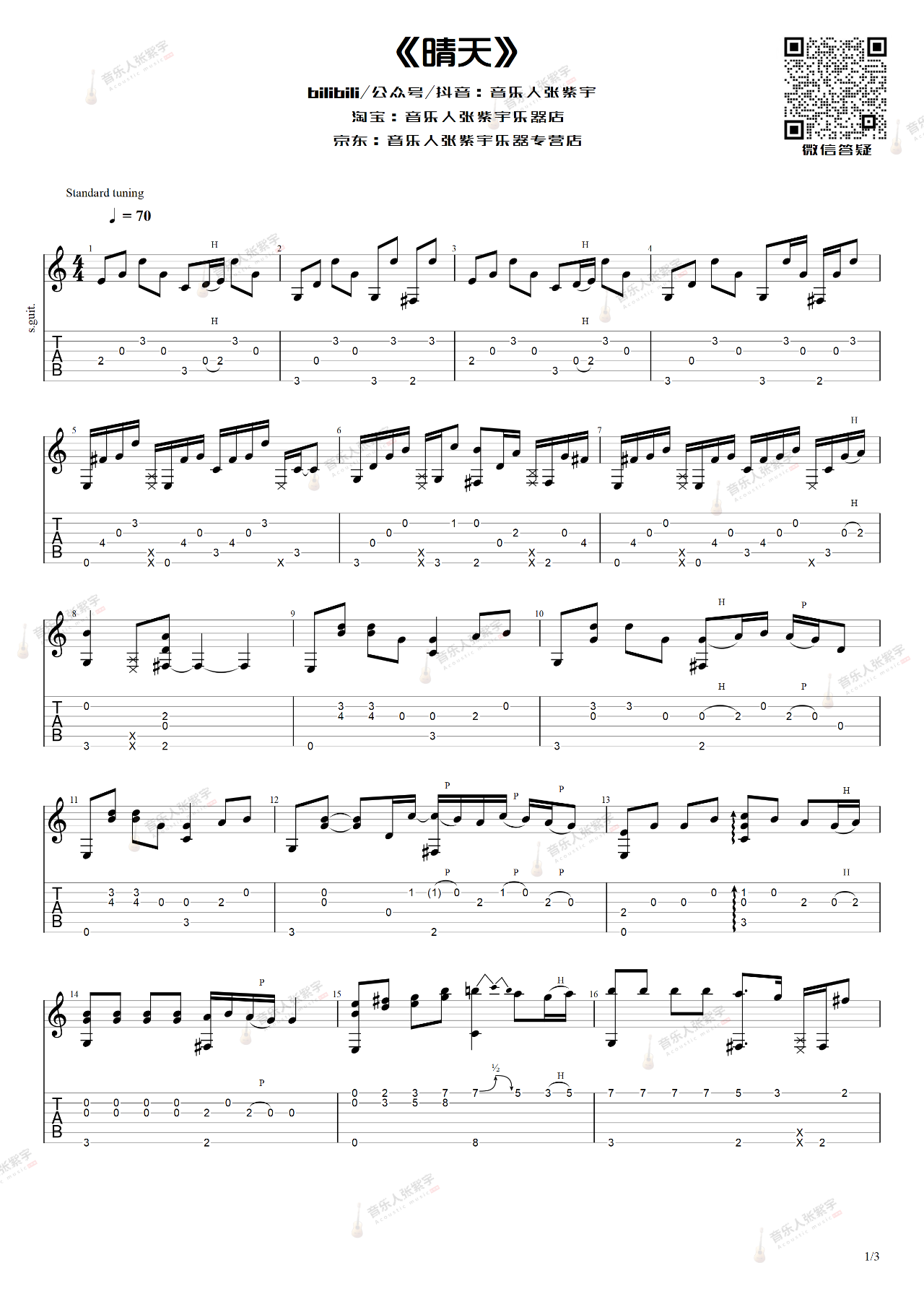 曲谱介绍: 周杰伦《晴天》,这是一首偏校园怀旧风的Britpop歌曲,作为周杰伦最热门的歌曲之一,吉他派已经收录整理了大量的吉他谱,这里是来自张紫宇老师编配指弹格式吉他谱,附视频教程讲解。 张老师说:我喜欢MV中大提琴演奏,和最后的rap部分,给人一种独具特色的艺术气质。词里的点点滴滴,让每一位听者都看到了曾经的自己,亦青涩浪漫、亦桀骜怅然。这次改编用的是标准调音,创作时并没有选择完全还原,而是加入了一些自己的感觉。那两个指弹常见的特殊技巧,大家注意练好。喜欢的话,可以试一试~  吉他弹唱演示及视频教学  《晴天》吉他指弹视频教程
