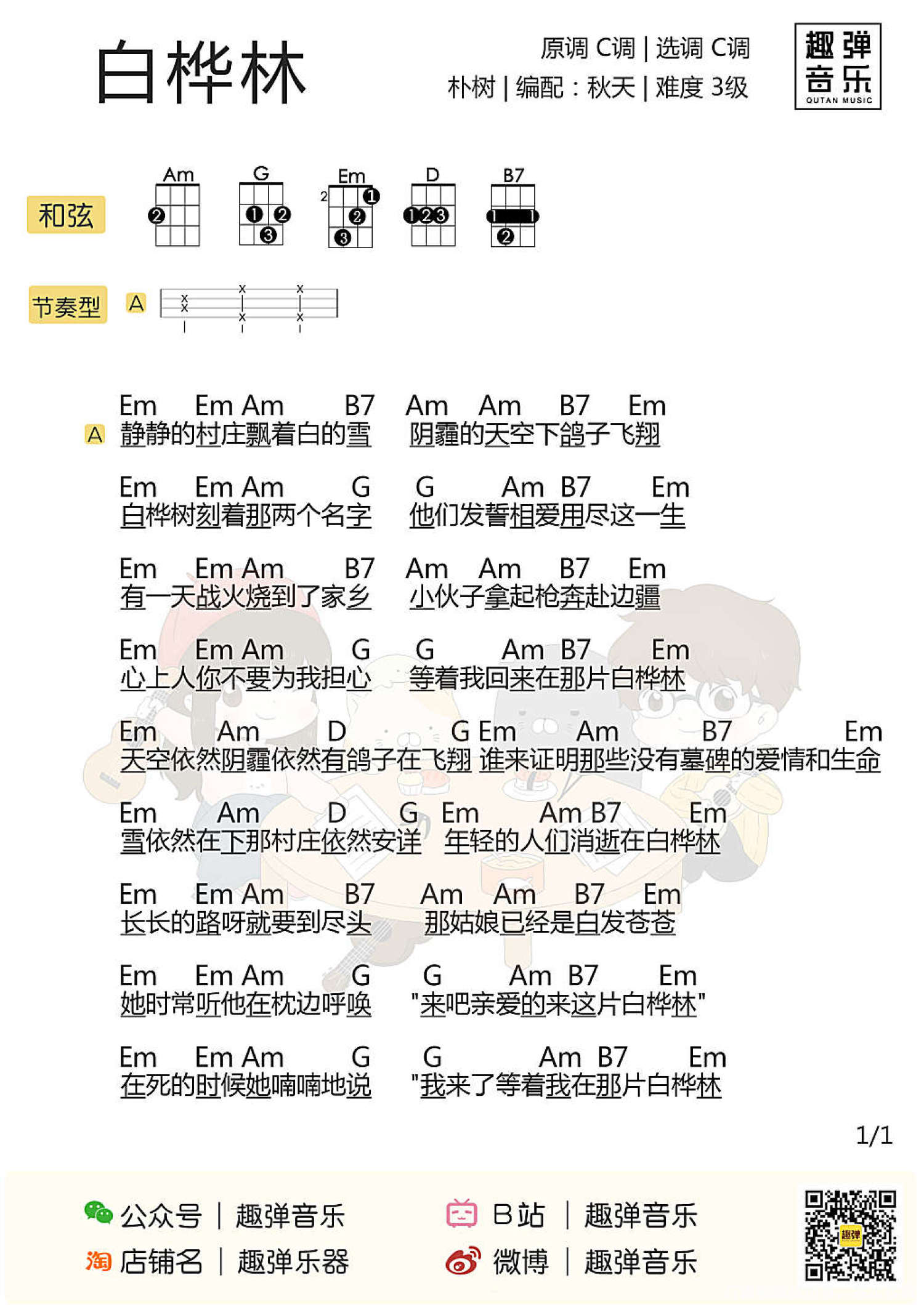 曲谱介绍: Aloha~今天跟大家分享的歌曲是来自 朴树的「白桦林」 这是朴树在1999年发行的歌曲 距今已经有十年的时间 可依然耐听~   白桦林ukulele谱