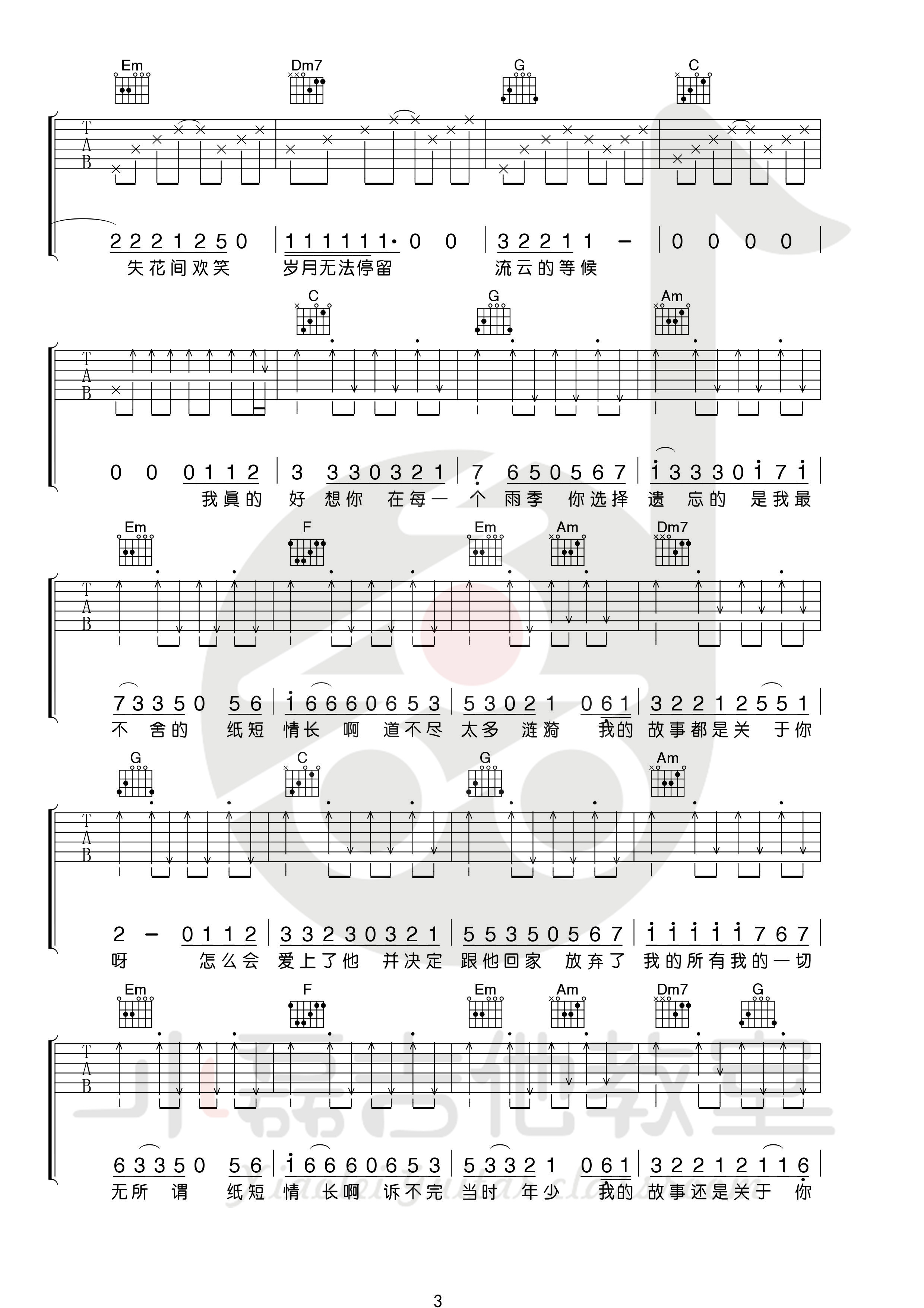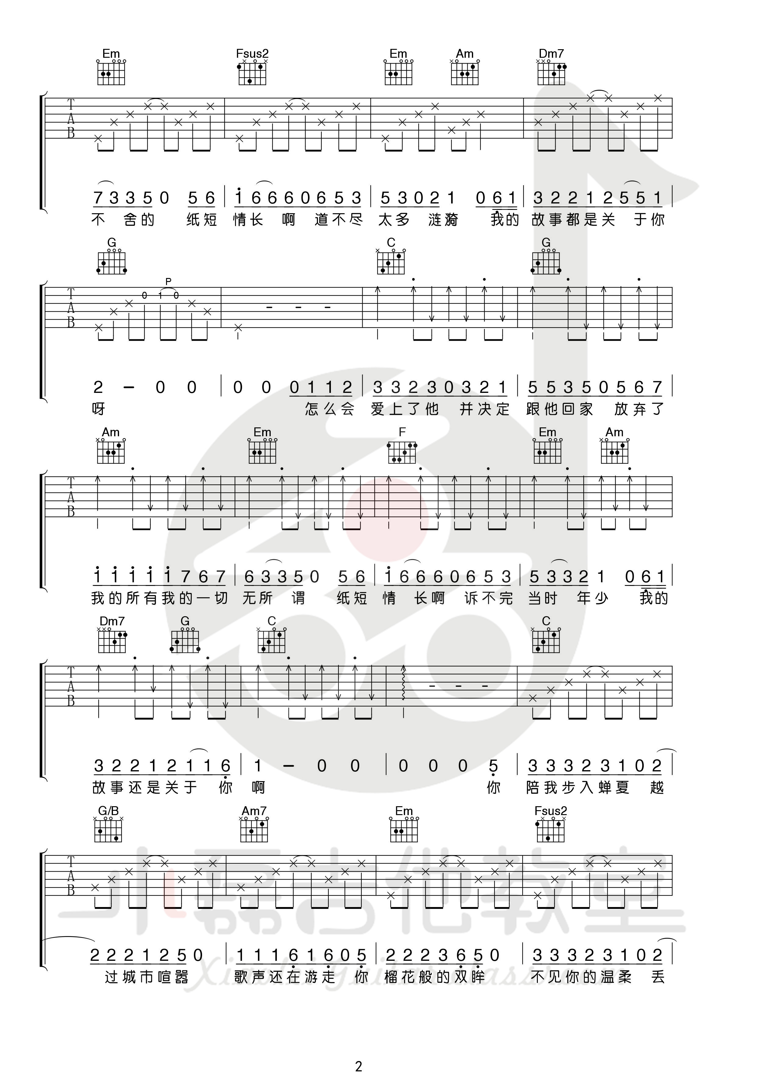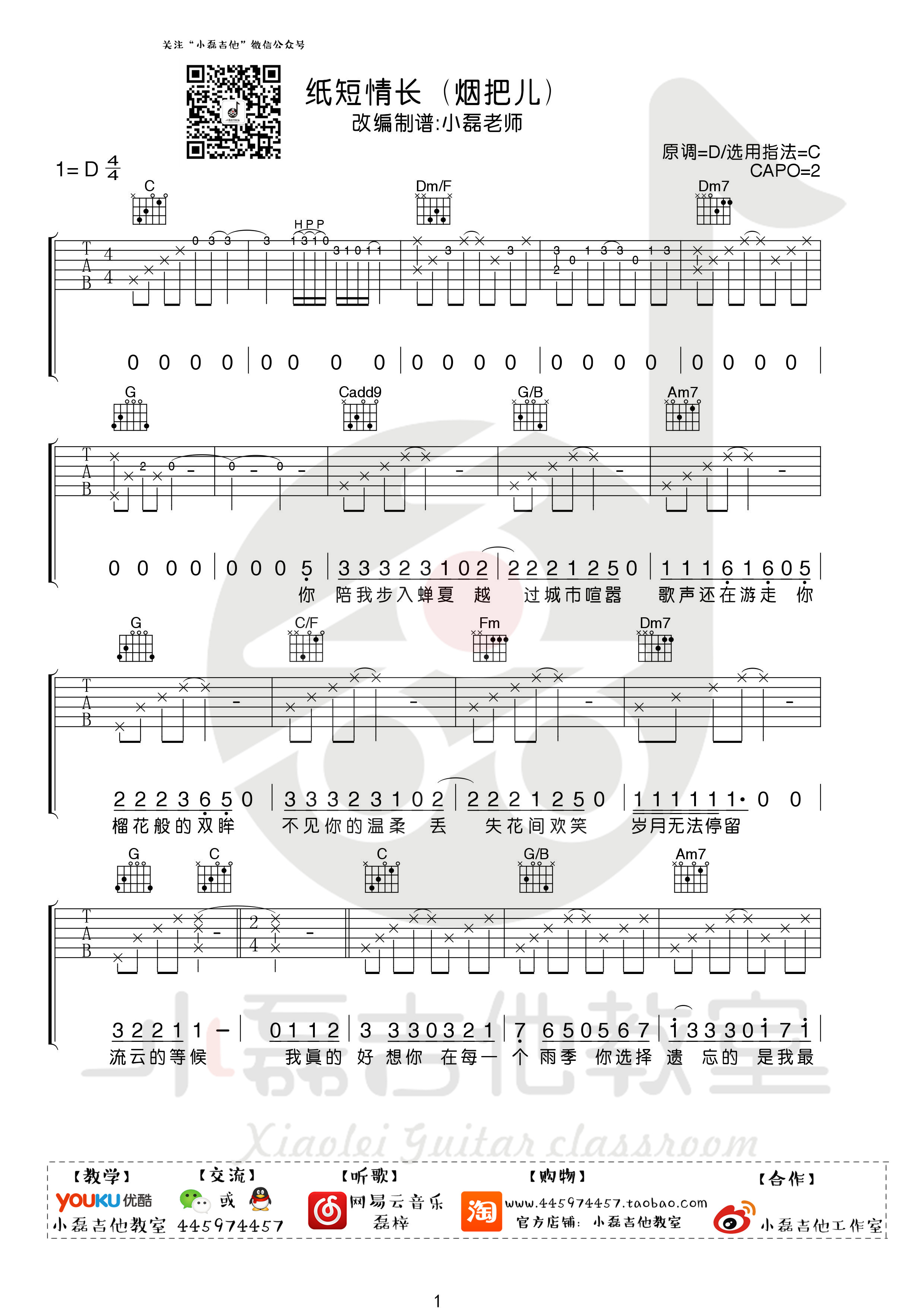 曲谱介绍: 纸短情长,几年前的热门歌曲,烟把儿把自己的思念唱进歌里,可纸短情长,道不尽我们的故事。时过境迁,我的故事还属于你,你的故事却再也没有了我的名字。  吉他弹唱演示及视频教学  《纸短情长》吉他弹唱教学视频 纸短情长吉他弹唱谱,来自小磊老师编配弹唱谱,这首歌的原版是乐队伴奏,有很多的midi音色,这里在编配的时候前奏和整体听感都比较还原,弹唱部分和扫弦部分都非常的简单易学,附教学视频讲解。 其他调版吉他谱: 纸短情长吉他谱_弹唱视频教学_C调男生版/G调女生版7t吉他教室 · 9190 次浏览