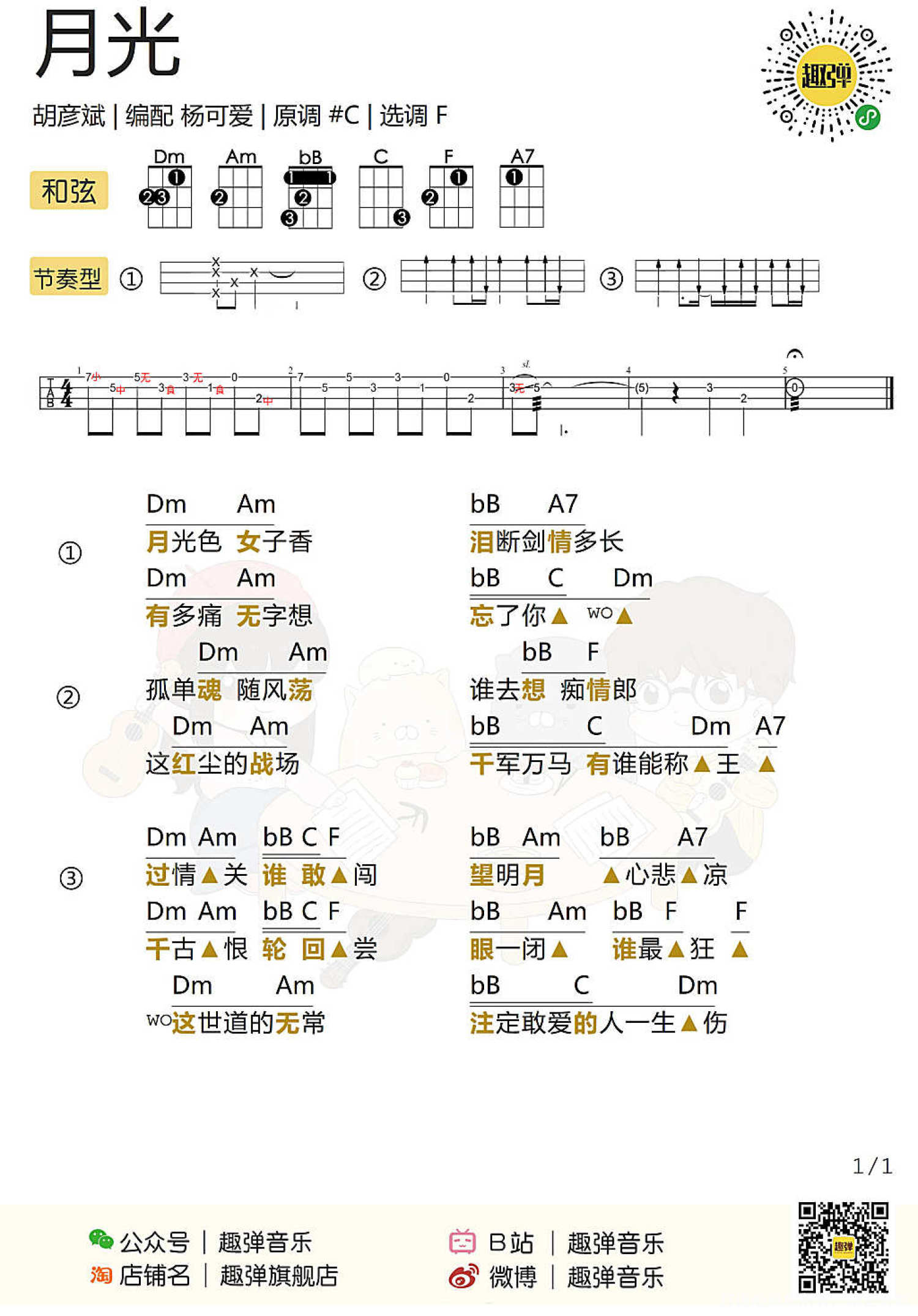 曲谱介绍: 月光丨杨可爱弹唱 以前超迷《秦时明月》这部动漫 连带着也很喜欢「月光」这首歌 当年有mp3之后 下载的第一首歌就是它! 不知不觉都已经过了这么多年了 这部动画和这首歌真的是 陪伴我们从小长到大~ 和可爱一起学会这首歌 一起回到那个宏伟的红尘乱世中~   月光丨Ukulele教学   月光尤克里里谱