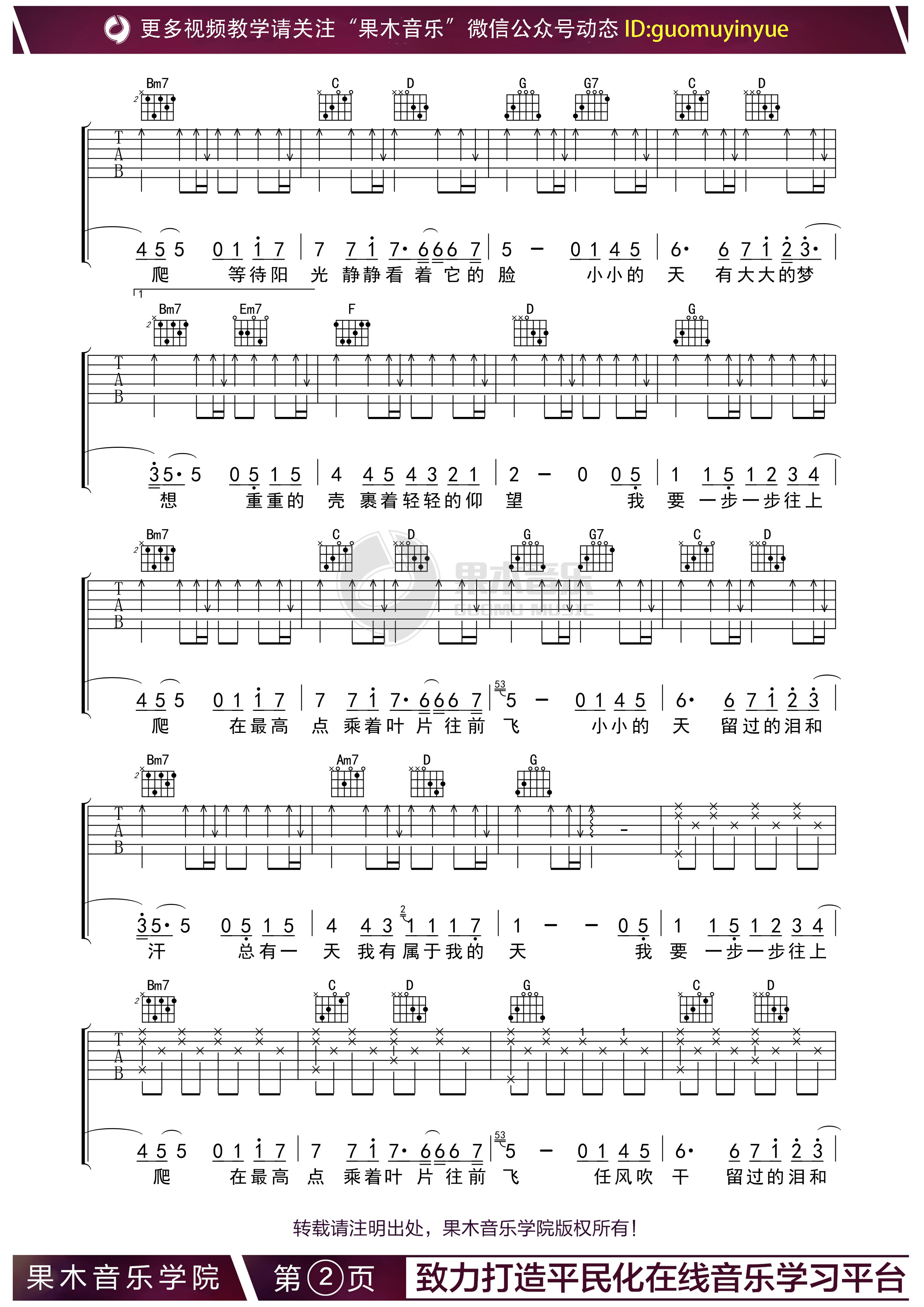 曲谱介绍: 蜗牛吉他谱,高清版吉他弹唱六线谱,来自果木音乐编配制谱,G调高清弹唱伴奏谱,共三张谱例。演奏用到了几个横按和弦,弹唱时注意分小节耐心练习换和弦,右手的伴奏音型难度一般,整体难度不大。喜欢这首歌的朋友推荐一首指弹谱:蜗牛吉他谱 周杰伦 指弹独奏吉他谱。