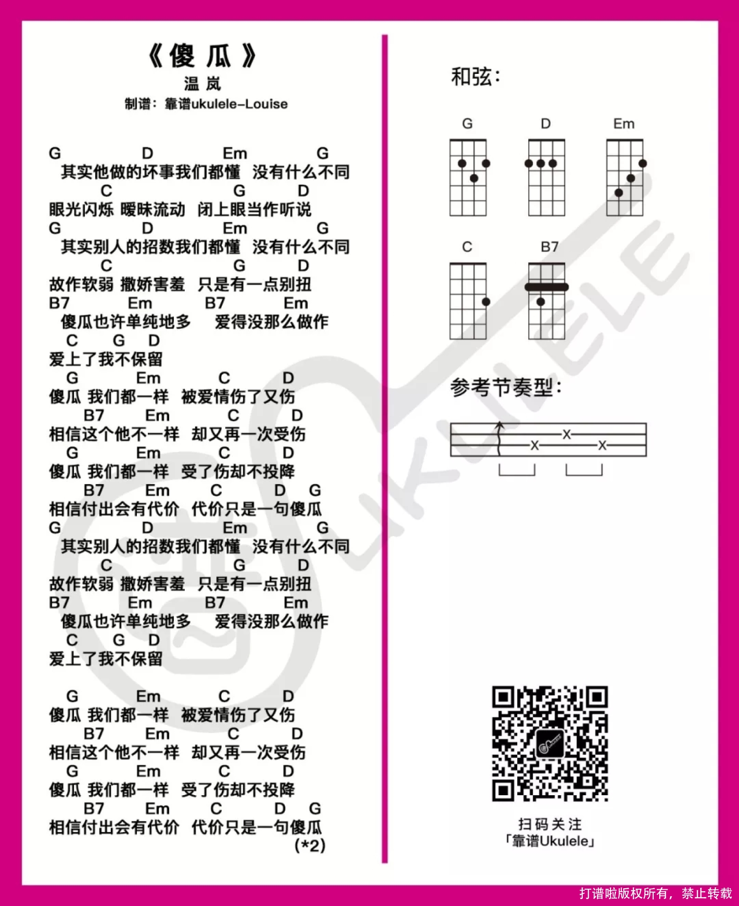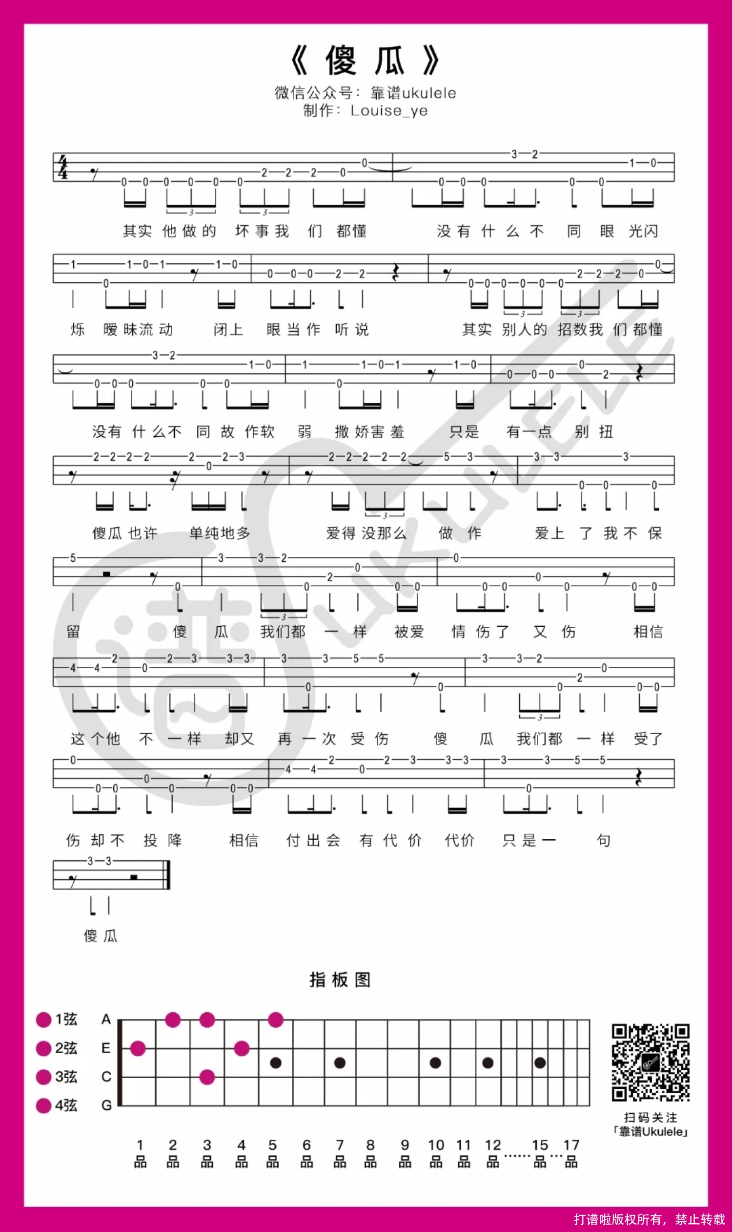 傻瓜这首歌唱出来不少女生心里那份纠结的情感,如果能遇到Mr.R,谁又会拿自己的真心换一段痛呢……面对感情这件事,深陷的时候会也许会使人变得无法思考,智商为0 的原因。有些人有些事明明心里清楚,却还是会给自己营造一个梦境逃避现实,直到不得不面对已知的结局……然后捧着自己那颗痛的不知道如何的心……换一句傻瓜。 傻瓜ukulele指弹谱 单音版 难度系数:★ 这首歌难度系数不高,看指板图就知道了,需要使用到的音不多,但是节奏上面控制可能要注意一下,有些地方会出现三连音代表三个音加起来节奏是1拍,会哼唱的就参考歌词判断一下吧。 傻瓜ukulele弹唱谱 难度系数:★☆ 给到的选调不是原调哦,原调略高,选调做了降调处理,所以如果想尝试原调的效果可以把变调夹夹在2品(Capo=2)。 比较少见的出现B7这个大横按,跟Bm差不多,使用到的频率没有很高建议好好练一下这个和弦~。其实中间细节有简化掉一两个和弦,所以可能有些细节的地方会稍显不足,但是总体还是过得去的咯,喜欢的朋友试试看吧。 想到一个新环节 听歌编故事哈哈哈 应该会很好玩? 拿这首歌先做个试验 Louise很小的时候曾经想过 做个小说家来的哈哈哈哈哈哈 —— 她遇到一个人,他失恋了 莫名其妙的情况下,他加了她的微信 一个像极了电影剧情老土的开场白 “你跟我的一个朋友很像” (谁都会想到是前女友咯, 哈哈哈故事都有老土的剧情开场白 是吧?) 然后是有一句没一句闲聊 她不善于跟陌生人聊很久 本以为聊个几句也就翻篇了 却没有想到陪着他度过了失恋的几个月 他们年纪差距有点大, 一开始只是觉得大叔很有趣 觉得一个失恋抑郁的人需要有人关心, 才能好的快一点 后来聊的时间久了 竟然发现慢慢喜欢上了大叔 他们无话不聊 她在他面前很自己 大叔总跟她说“小丫头要学会撒娇,撒娇女人最好命” 可她不懂得如何故作软弱撒娇(歌词哈哈) 她只想在大叔找到另一半之前,多陪陪大叔 她的开心很简单 可能她是真的太喜欢大叔 才会觉得他跟别人不一样 有可能只是她太傻…… 喜欢一个人就只想对他好 不管结局是怎样 不管自己会怎样 (来咯来咯,音乐起~) …… 傻瓜也许单纯的多,爱得没那么做作 爱上了,我不保留 …… 结局 大叔找到了另一半 她告白给失恋画上句号 她其实有一个心病 对在亲密距离的异性会明显的排斥 可是大叔在她身边的时候 她从来都没有排斥过 告白前 她让大叔抱抱她 本以为会很介意的她 这时候才知道 原来她可以这么靠近一个 喜欢的人 转身离开的她 哭了,哭得很伤心 才发现想把那个生病的心 掏出来是怎样的心情 (此处应该有音乐) …… 傻瓜 我们都一样,受了伤却不投降 相信付出会有代价,代价只是一句傻瓜 …… 谢幕 (鼓掌哈哈哈哈) —— 咳咳咳,好了,故事好像没有很精彩……编不下去,一曲伤心情歌,被整的画风不对了哈哈哈哈哈哈哈哈,故事跟歌也很硬……没有半毛钱关系……(所以没有天赋写小说哈哈哈哈哈就是这样的)。 其实伤心情歌的故事也不一定要发生在两个相爱的人之间,单恋暗恋的人也一样是傻瓜来的~。 皮一下,给你谱子啦~