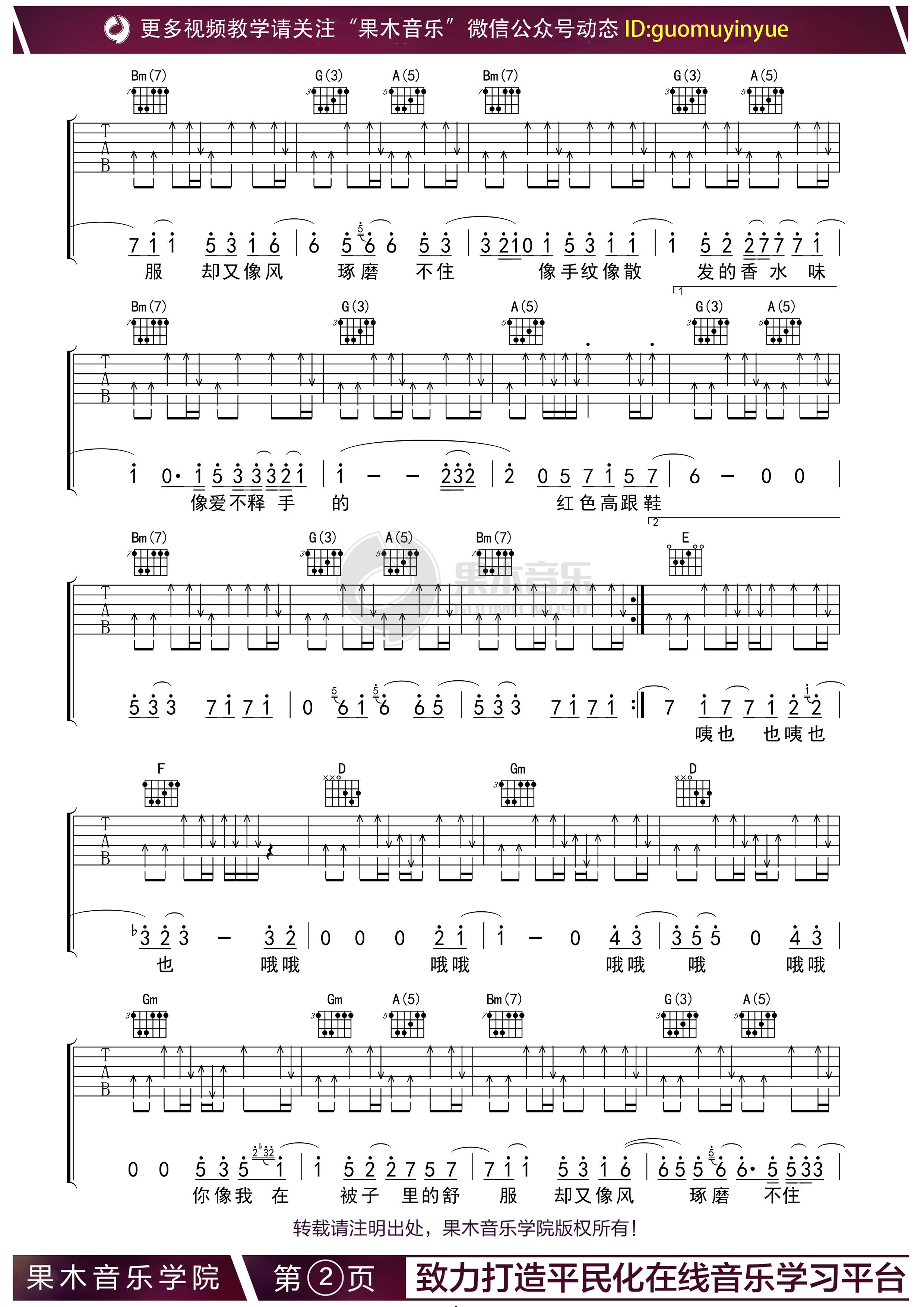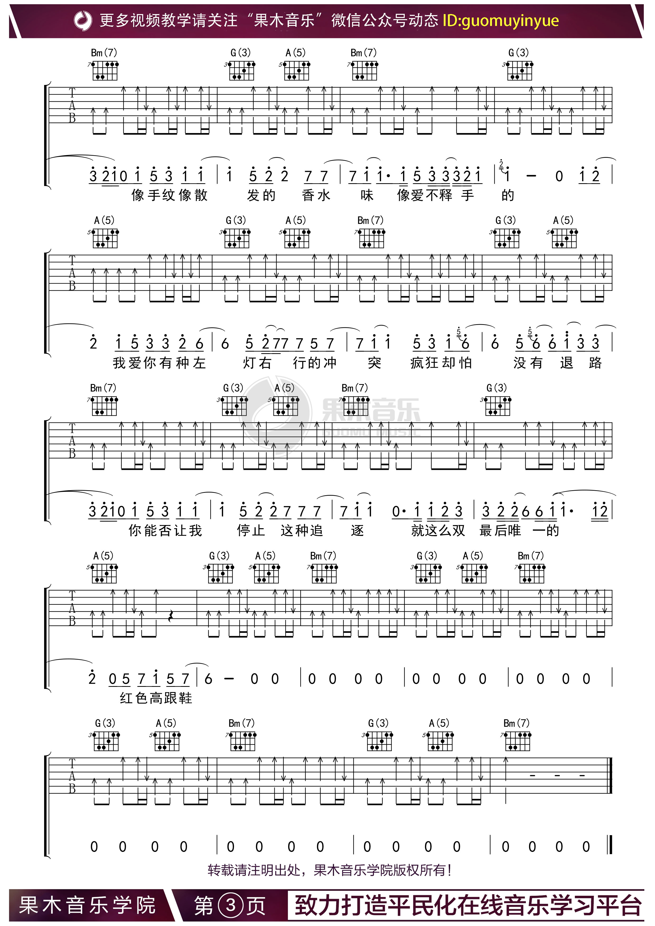 曲谱介绍: 红色高跟鞋吉他谱,D调原调版吉他弹唱谱,来自果木编配弹唱伴奏谱。这首歌的伴奏方式是完全采用扫弦的节奏来完成的,所以演奏一定要注重节奏感,扫出律动感。左手的和弦部分也比较难,需要大家很好的掌握大横按。 歌曲名称:红色高跟鞋演唱歌手:蔡健雅编配选调:1=D歌曲原调:1=D变调夹:按需选择所用和弦:G5、A5、B5、G(3)、A(5)、Bm(7)、D(5) 、E、F、D、Gm 曲谱类型:弹唱六线谱演奏速度:88拍每分钟图谱数量:共 3 张制谱编配:果木音乐演奏难度: 蔡健雅《红色高跟鞋》,这首歌对现代都市男女爱情观的解读可谓透彻,越是热烈的爱情故事越是只有一个主角,成年人之间的爱情,是不追问,是不解释,是心照不宣。