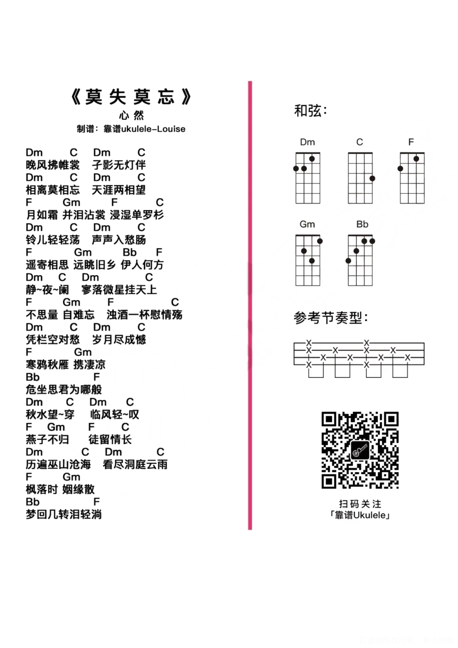 玩过看过《仙剑》的一定都知道莫失莫忘铃是什么吧? 莫失莫忘铃是仙剑游戏中的一种道具,是李逍遥和林月如的信物。本为苗疆一种同心蛊,一胞双生,即使相隔千山,也能遥相呼应。月如身上挂着的铃,叫做“莫失”;逍遥身上挂着的铃,叫做“莫忘”。所以当林月如在锁妖塔为了救赵灵儿牺牲的时候,铃铛也随之脱落了,也就意味着,月如不在了……虽然一开始的时候其实并没有很喜欢林月如,但是当她离开的时候,真的是心都碎了……说好的要吃到老玩到老的承诺就这样不在了…… 留言要这首歌的时候,我还是有点小吃惊的,勾起了一小段关于《仙剑》回忆。 莫失莫忘ukulele指弹谱 单音版 难度系数:★☆ 节拍器的设置建议是90bpm左右试试看,快一点慢一点可以在这个基础上去调整。 好像第一次分享的指弹谱空弦音如此之少仅用到三弦的部分,整首歌旋律简单所以单音使用到的不多,指法的部分我是根据自己的情况设置的,我觉得这样就比较大的精简掉一些不必要的部分,至于精简的情况好奇宝宝可以参考谱子最下方的指板图找找答案了。 莫失莫忘ukulele弹唱谱 看到求谱去搜歌的时候发现原来还有一个有填词的版本,演唱是心然,这个版本的收录在《仙剑奇侠传插曲辑 庆功版》,发行于2005年,也是蛮多年过去了,另收录在了心然自己的专辑《空》中。 曲子,应该是整整影响了一代人的,回忆起仙剑电视剧中那些故事,真的有太多感人的画面。这首曲子更是给人留下深刻的印象,纯音乐版的有一个女声(风铃)哼唱,给整首歌添加了特别的情绪在其中。 今天分享的填词版本,不知道之前有没有听过呢? 难度系数:★☆ 给到的选调不是原调哦,原调略高了一点,所以如果想尝试原调的效果可以把变调夹夹在1品(Capo=1)。 和弦应该是不难的,对于不喜欢小横按大横按的朋友,真的就只有一句话建议,多练,不能偷懒的,没有那么的懒惰和弦可以去选择,好好认真的对待每个和弦吧~。 节奏型的口诀:(124 3)(2 3)*2。