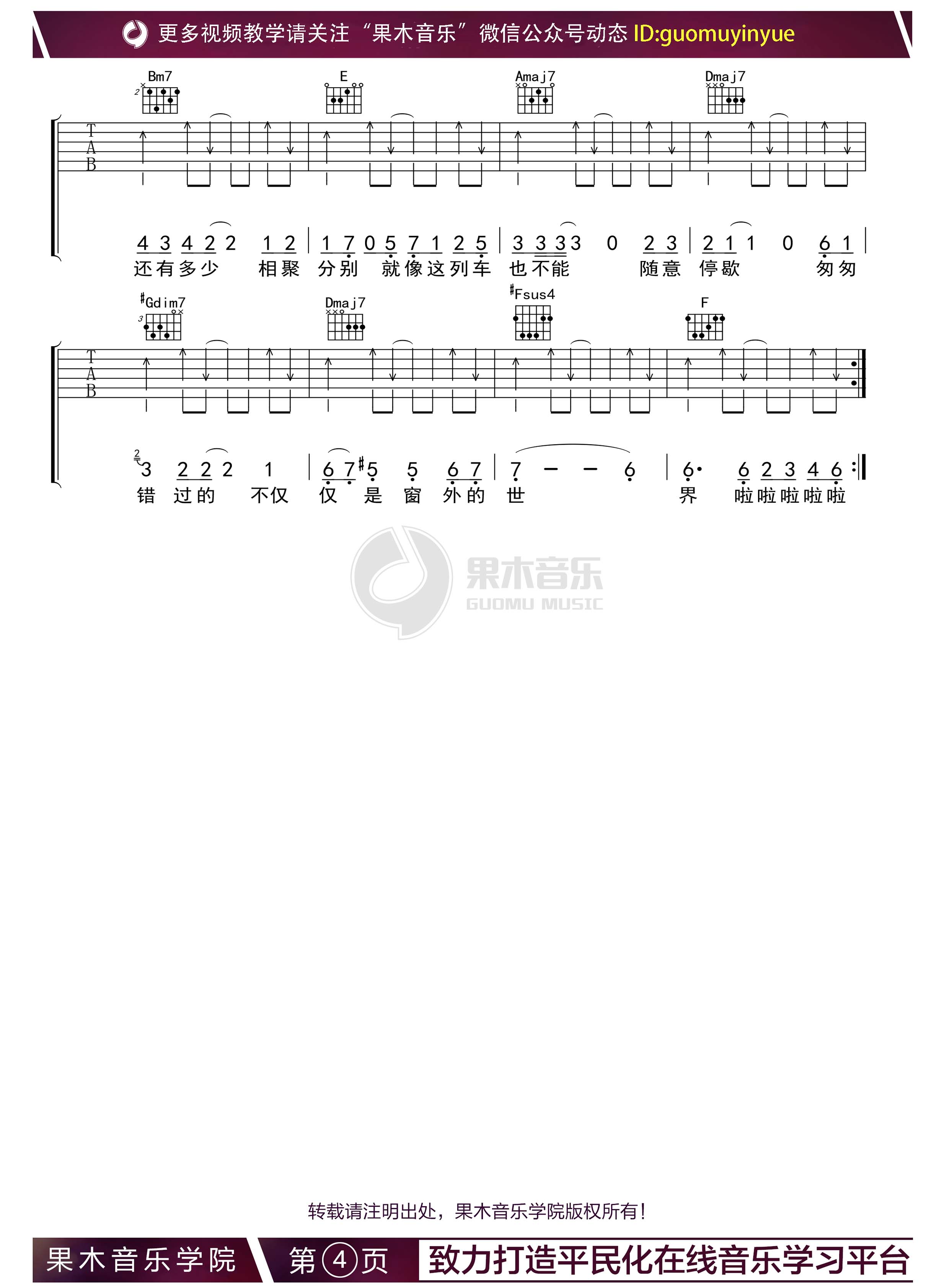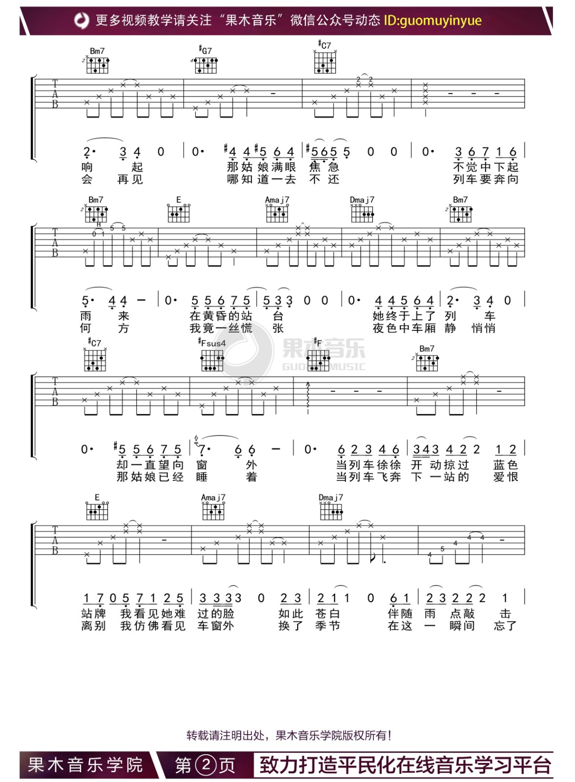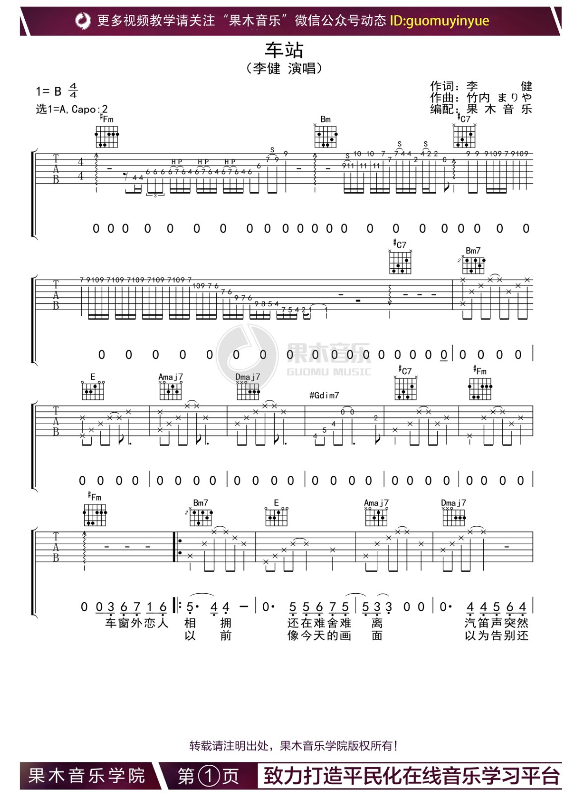 曲谱介绍: 车站吉他谱,李健演唱歌曲,来自果木老师编配分享。本吉他谱采用A调和弦指法编配,原调B调,演奏建议变调夹夹第二品。歌曲演奏难度三星,主要体现在和弦及前奏的指法上。 下雨的车站,黄昏的站台,蓝色的站牌。满眼焦急的姑娘,靠窗默默流泪的男生。汽笛声,不知下一站去何处的飞奔列车。李健《车站》,每一句歌词都是一个画面,一个故事,颇有些俄罗斯冬日的味道。在诗意贯穿悠扬的旋律里,让人不知不觉沉浸其中。 歌曲名称:车站演唱歌手:李健编配选调:1=A歌曲原调:1=B变调夹:第二品所用和弦:#Fm、Bm、#C7、Bm7、E、Amaj7、Dmaj7、#G7、#Fsus4、#F 曲谱类型:弹唱六线谱演奏速度:97拍每分钟图谱数量:共 4 张制谱编配:果木音乐演奏难度: