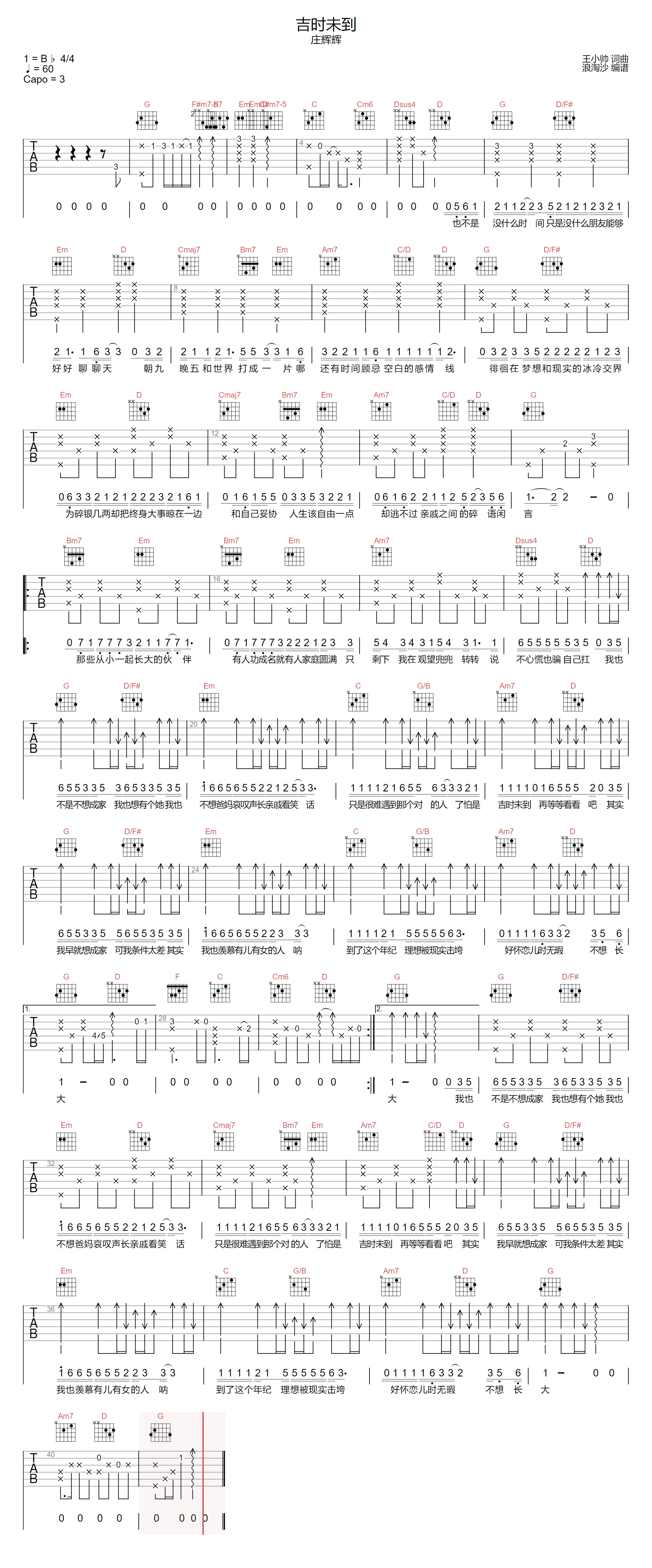 曲谱介绍: 吉他谱介绍:吉时未到吉他谱,庄辉辉演唱的一首歌曲,4/4拍的节奏,这首歌曲的原调为降B调,这里曲谱采用了G调指法进行编配,演唱时夹变调夹3品可回到原调,也可根据个人实际嗓音情况选择。曲谱由琴谱网更新上传,共1张高清图片弹唱吉他谱例,来源于@浪淘沙编配出品。这首歌表达的是现实中很多人不是不想结婚,只是没有遇到合适的,一旦吉时到了,自然会水到渠成。