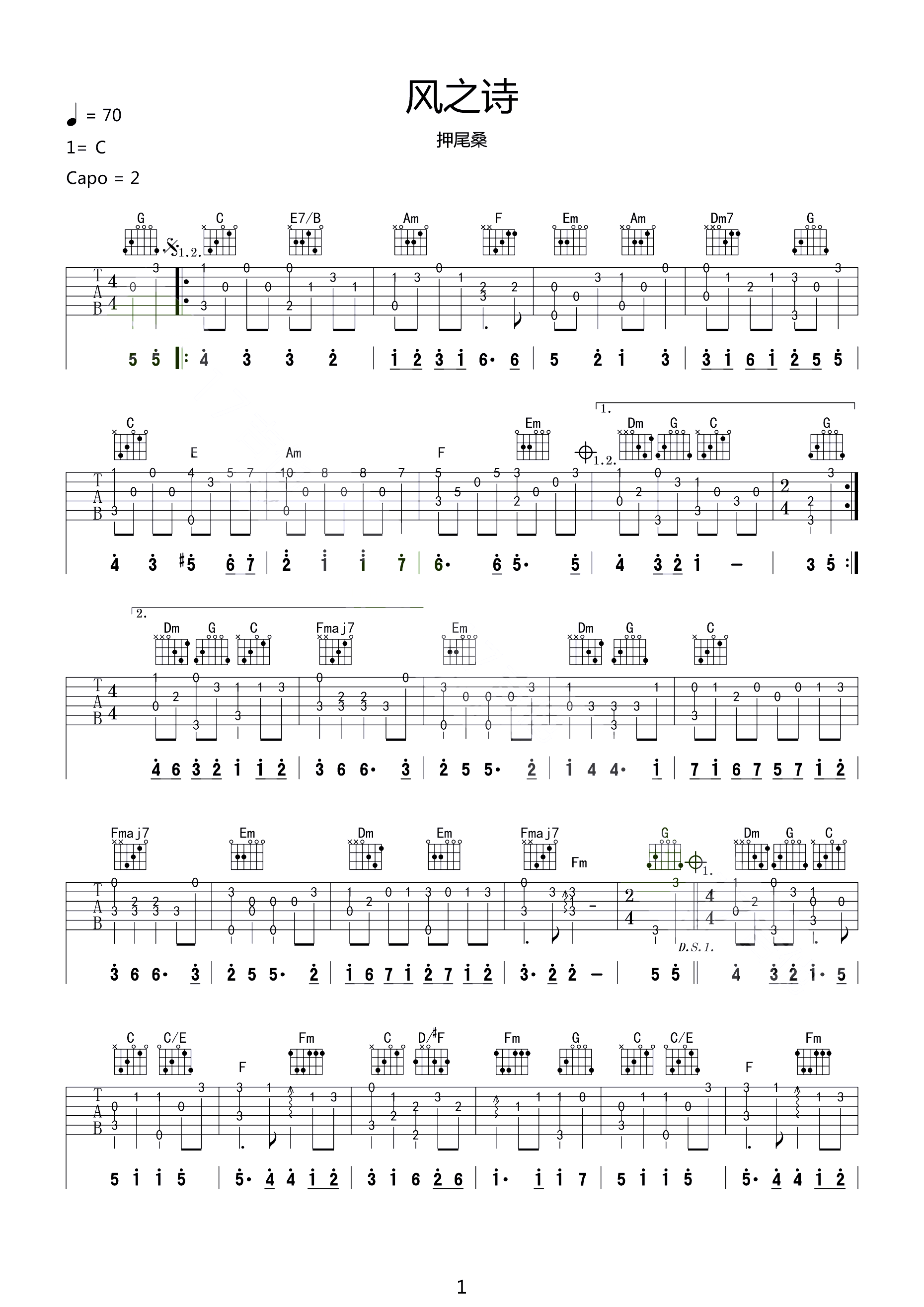 风之诗吉他谱 - 押尾桑 - 吉他独奏谱