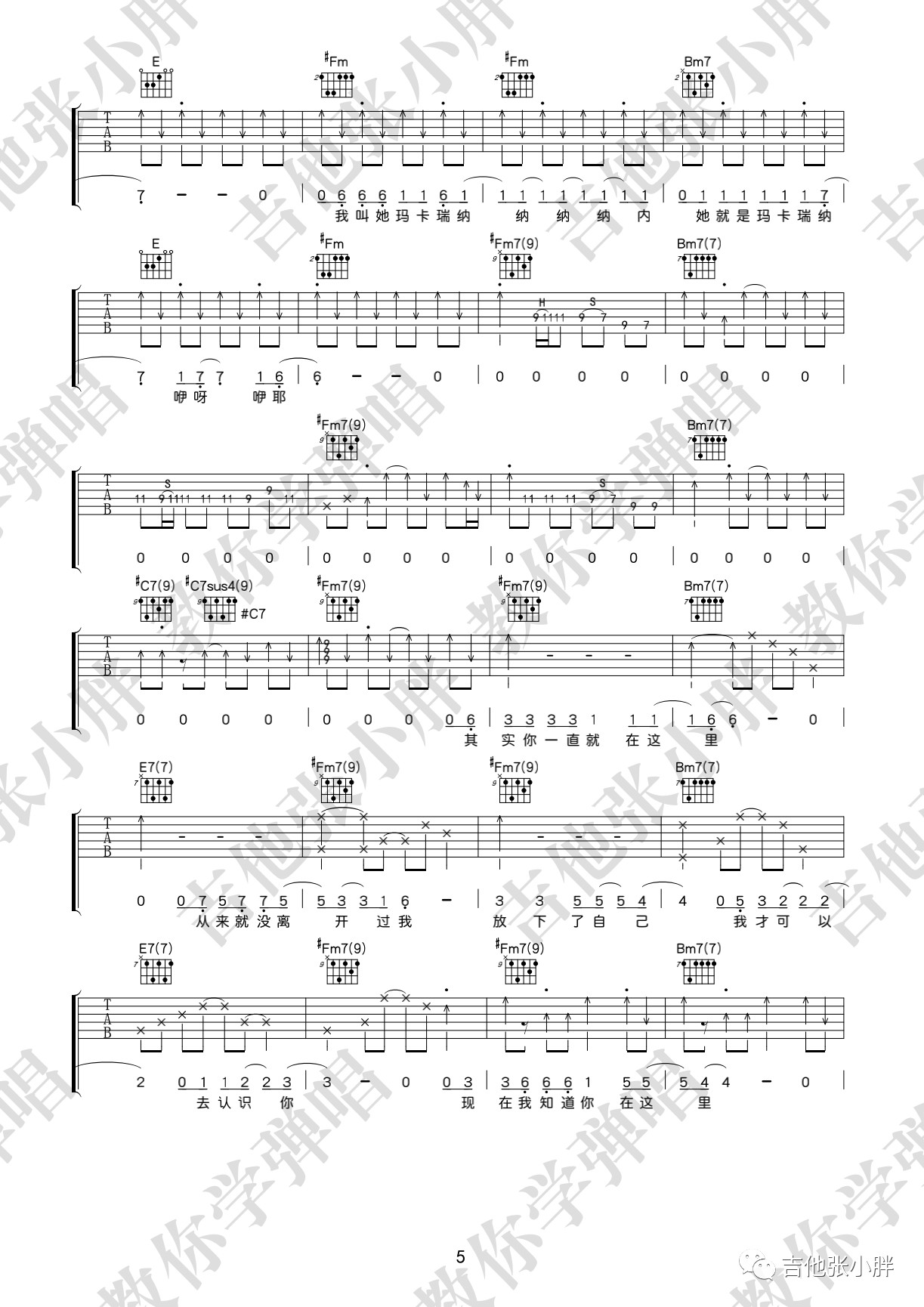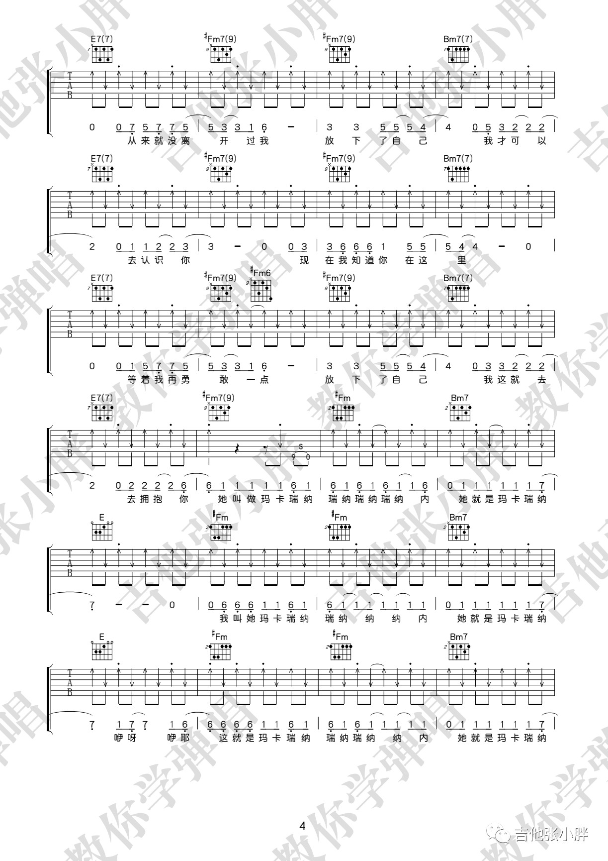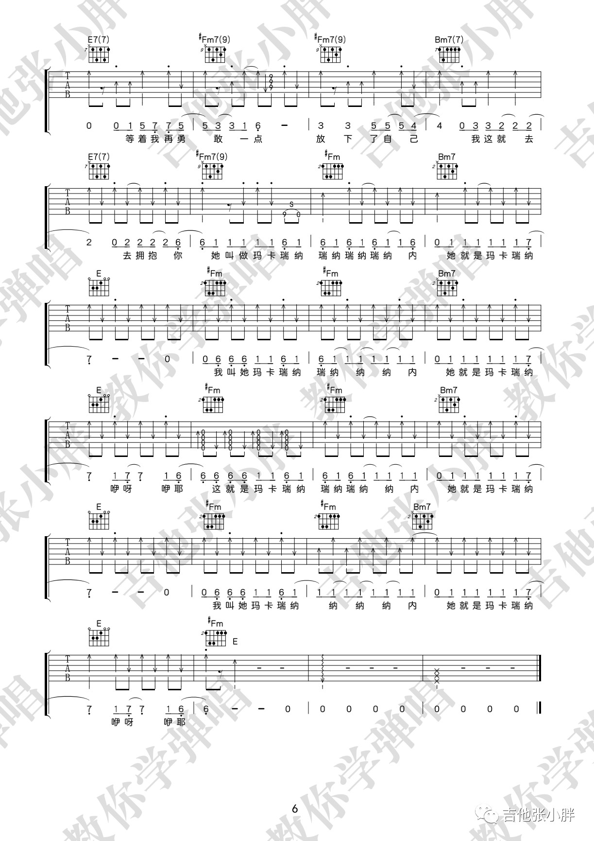 曲谱介绍: 海龟先生《玛卡瑞纳》,玛卡瑞纳其实是一类对象,也可以说是一种信仰的代替。至于玛卡瑞纳这个词,就是主唱李红旗的龟言龟语~当你找到自己的内心,并诚实的面对自己的时候,相信你也会不顾一切抛下所有去拥抱玛卡瑞纳~玛卡瑞纳吉他弹唱谱,来自吉他张小胖老师编配六线谱,附演示视频示范。这首歌的演奏基本都是大横按,初阶的朋友可以借着这首歌把高把位的大横按练熟,再去低把位攻克F和弦。另外就是右手的节奏型变化比较多,而且有很多是即兴扫的,大家可以体验一下怎样扫弦听起来会比较有“灵魂”。《玛卡瑞纳》吉他弹唱演示视频