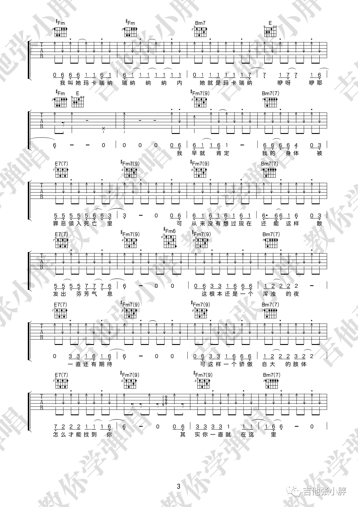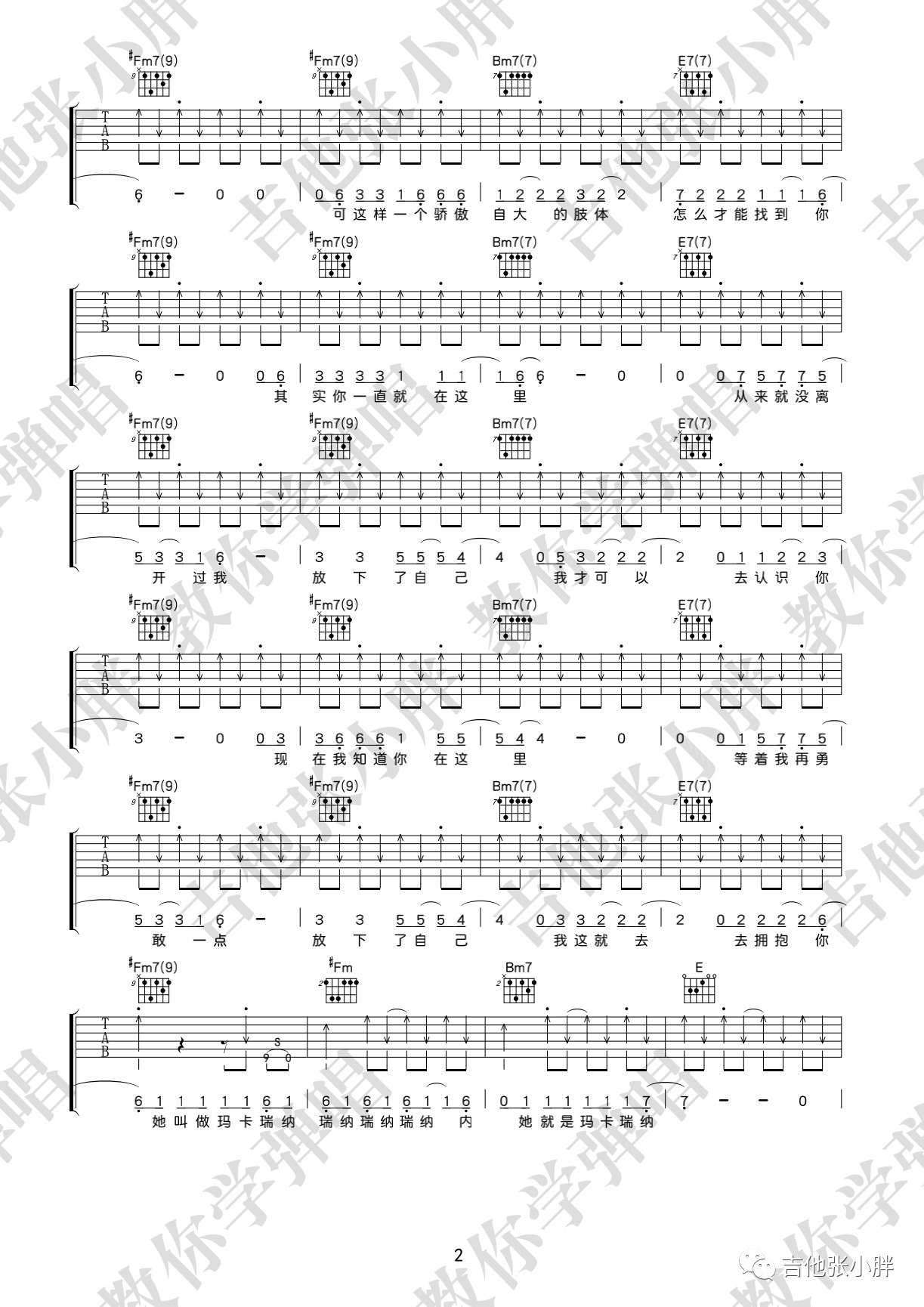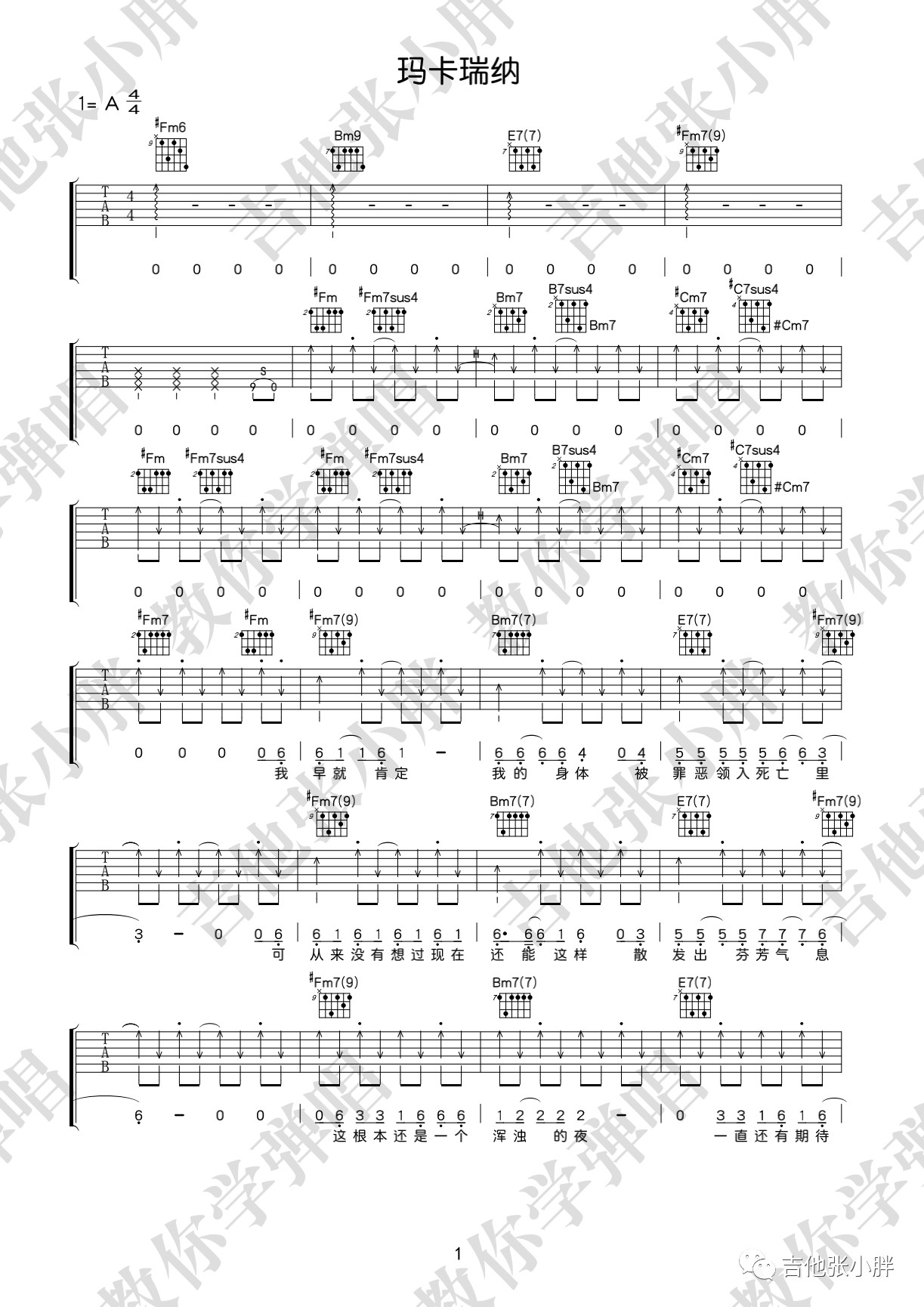 曲谱介绍: 海龟先生《玛卡瑞纳》,玛卡瑞纳其实是一类对象,也可以说是一种信仰的代替。至于玛卡瑞纳这个词,就是主唱李红旗的龟言龟语~当你找到自己的内心,并诚实的面对自己的时候,相信你也会不顾一切抛下所有去拥抱玛卡瑞纳~玛卡瑞纳吉他弹唱谱,来自吉他张小胖老师编配六线谱,附演示视频示范。这首歌的演奏基本都是大横按,初阶的朋友可以借着这首歌把高把位的大横按练熟,再去低把位攻克F和弦。另外就是右手的节奏型变化比较多,而且有很多是即兴扫的,大家可以体验一下怎样扫弦听起来会比较有“灵魂”。《玛卡瑞纳》吉他弹唱演示视频