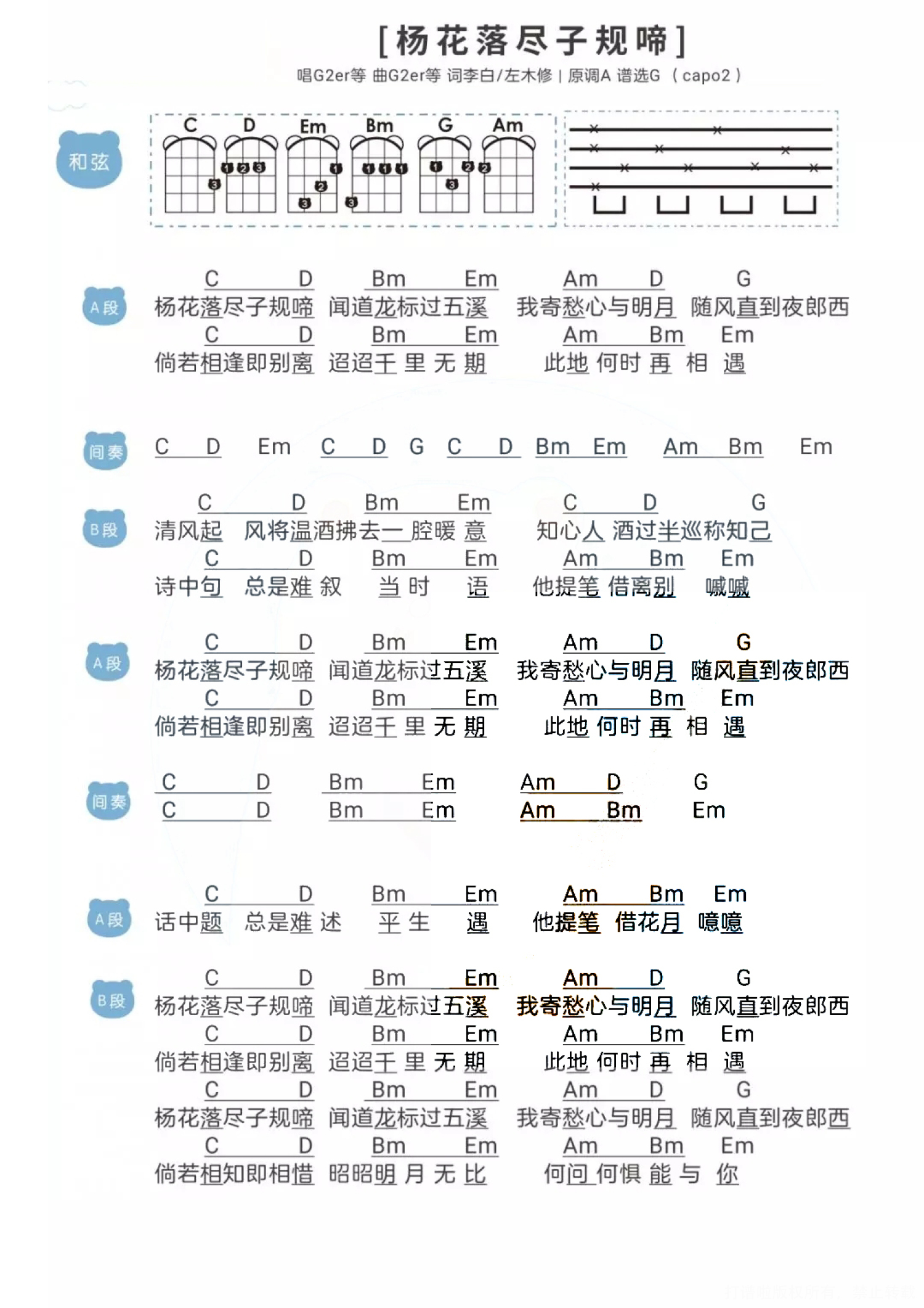 曲谱介绍: 诗编成歌曲,传统与现代音乐的结合,不得不说被圈粉了 "我寄愁心与明月,随风直到夜郎西" 杨花落尽子规啼ukulele谱