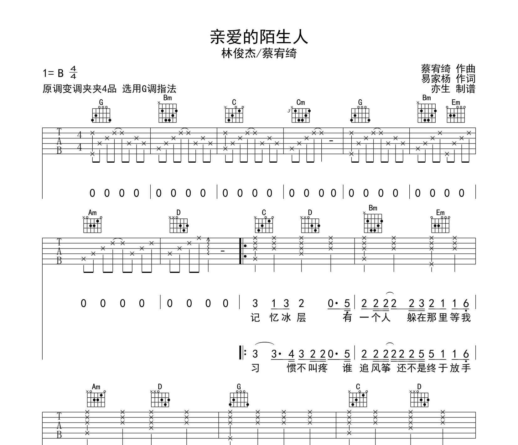 曲谱介绍: 亲爱的陌生人吉他谱,来自@亦生编配扒谱,采用G调和弦指法演奏,推荐变调夹夹第4品,原调为B调,也可以根据个人嗓音灵活选择变调夹位置,演奏速度大约每分钟95拍,演奏难度为简单。