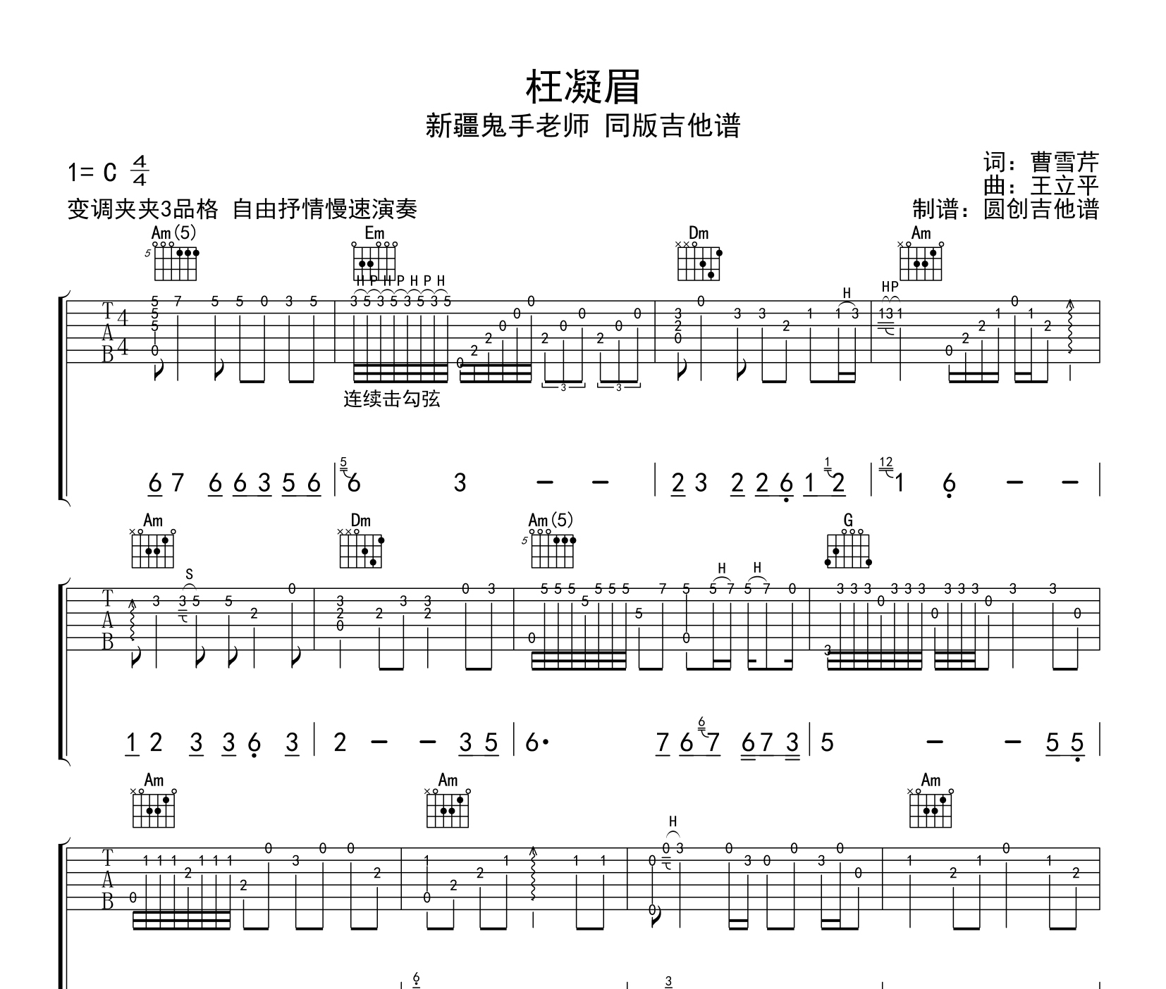 曲谱介绍: 枉凝眉吉他谱,新疆鬼手同版来自圆创吉他编配制作,C调和弦指法演奏版,原调Eb调,推荐变调夹夹3品,大家也可以根据实际情况选择变调夹,附指弹演示音频试听。