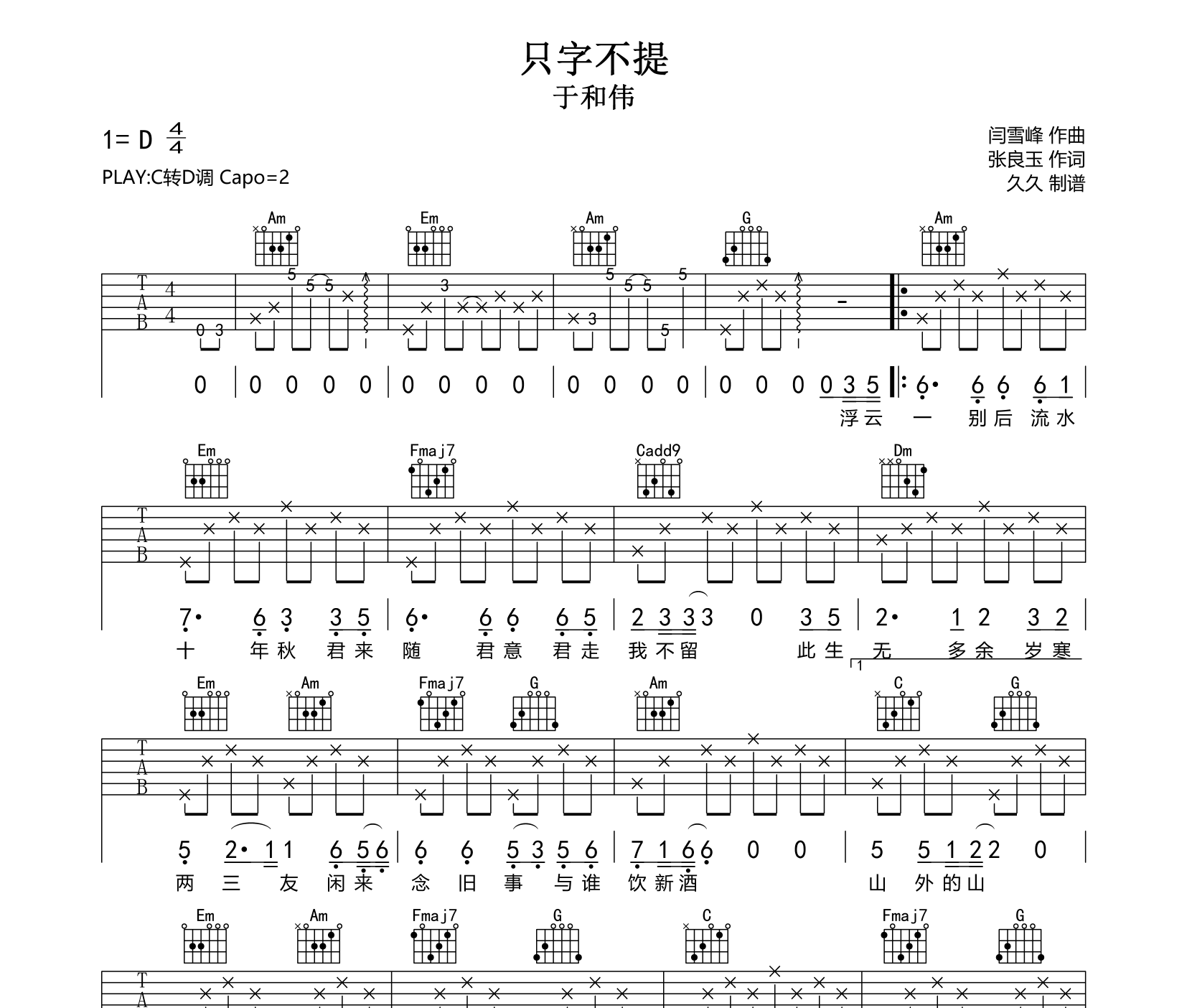 只字不提吉他谱 - 于和伟 - D调吉他弹唱谱