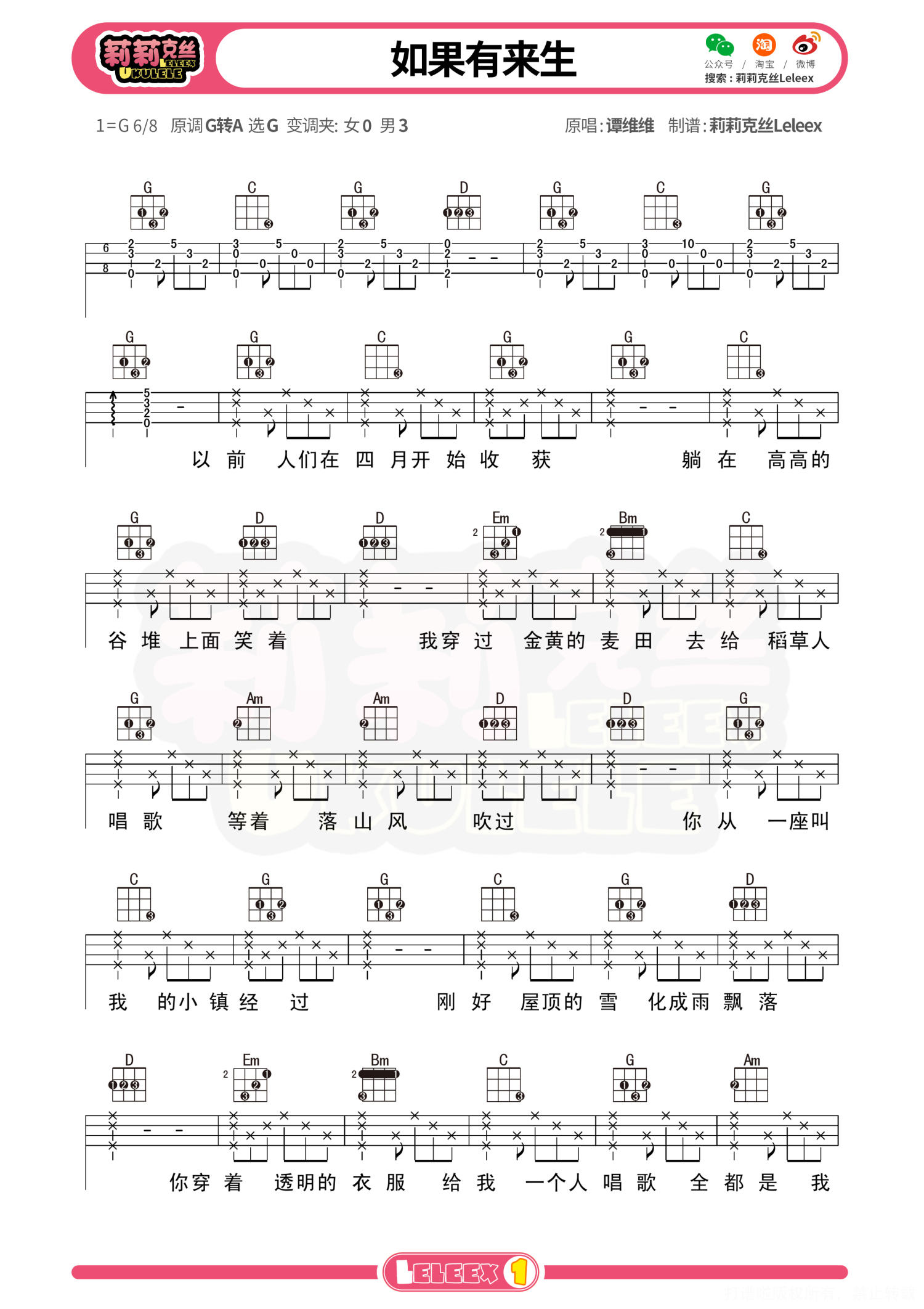 曲谱介绍: 《如果有来生》尤克里里谱-谭维维 莉莉克丝 更多尤克里里曲谱/教学  关注@莉莉克丝Leleex