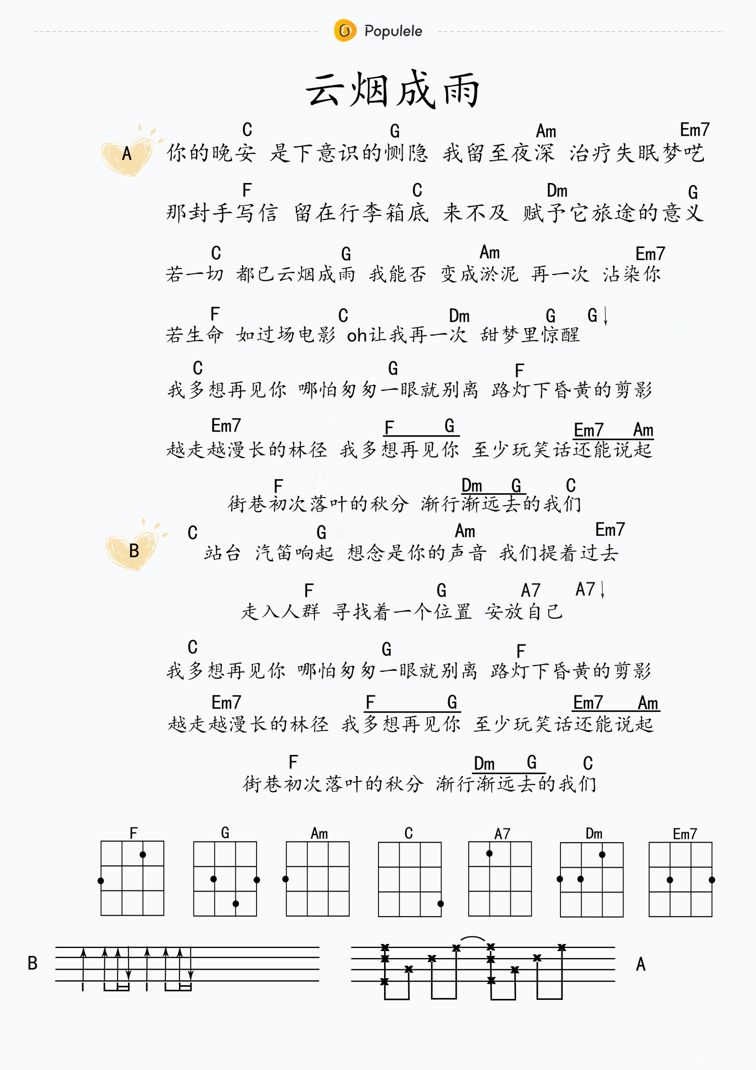 曲谱介绍: 房东的猫《云烟成雨》尤克里里谱,采用C调指法编配,共有1张高清图谱,免翻页排版设计。