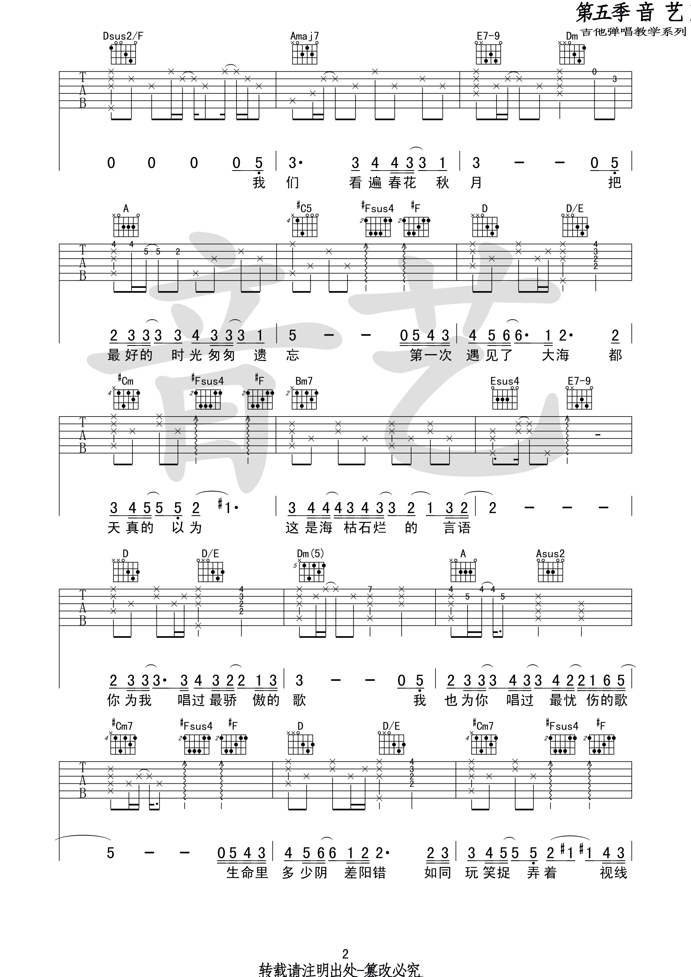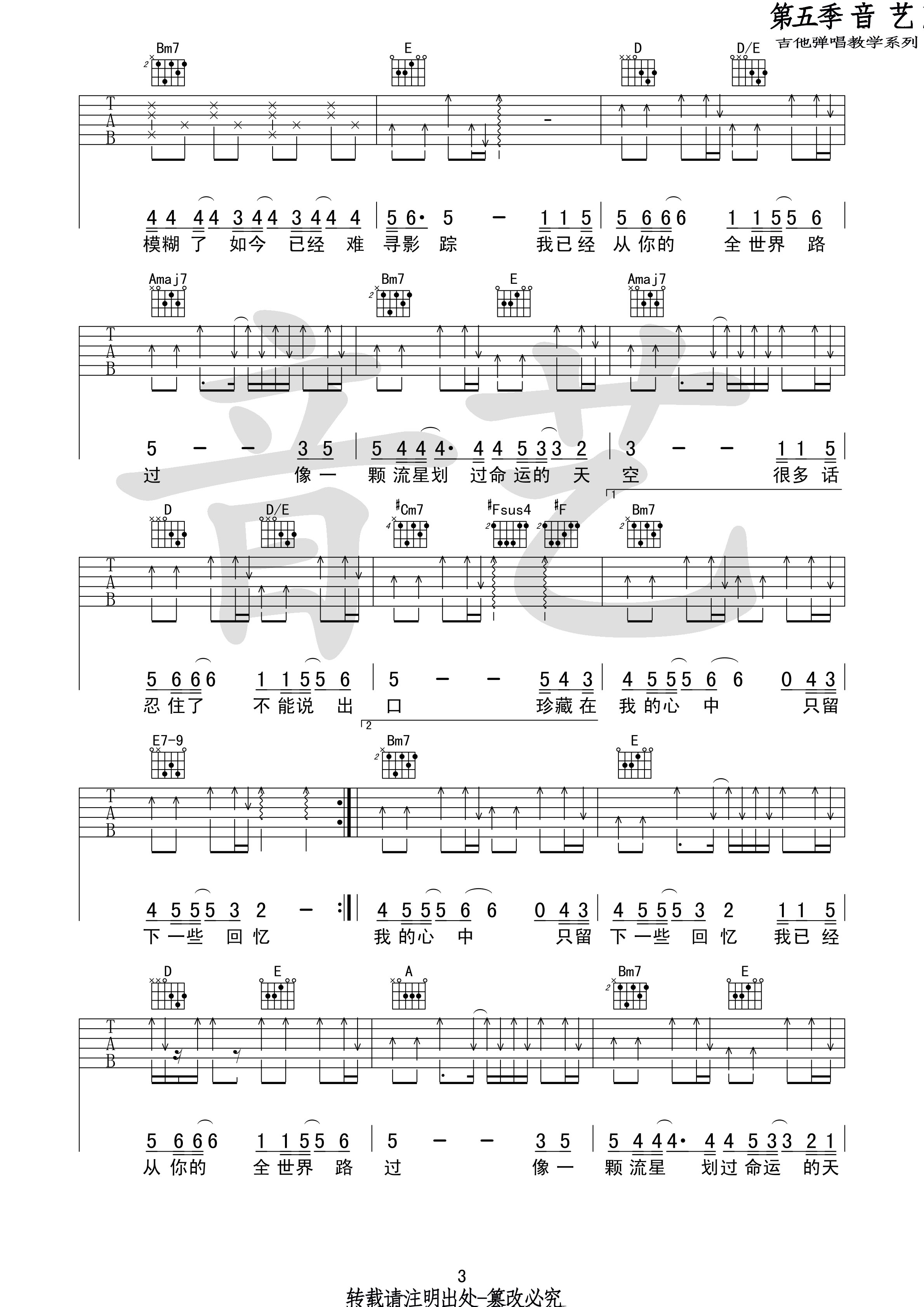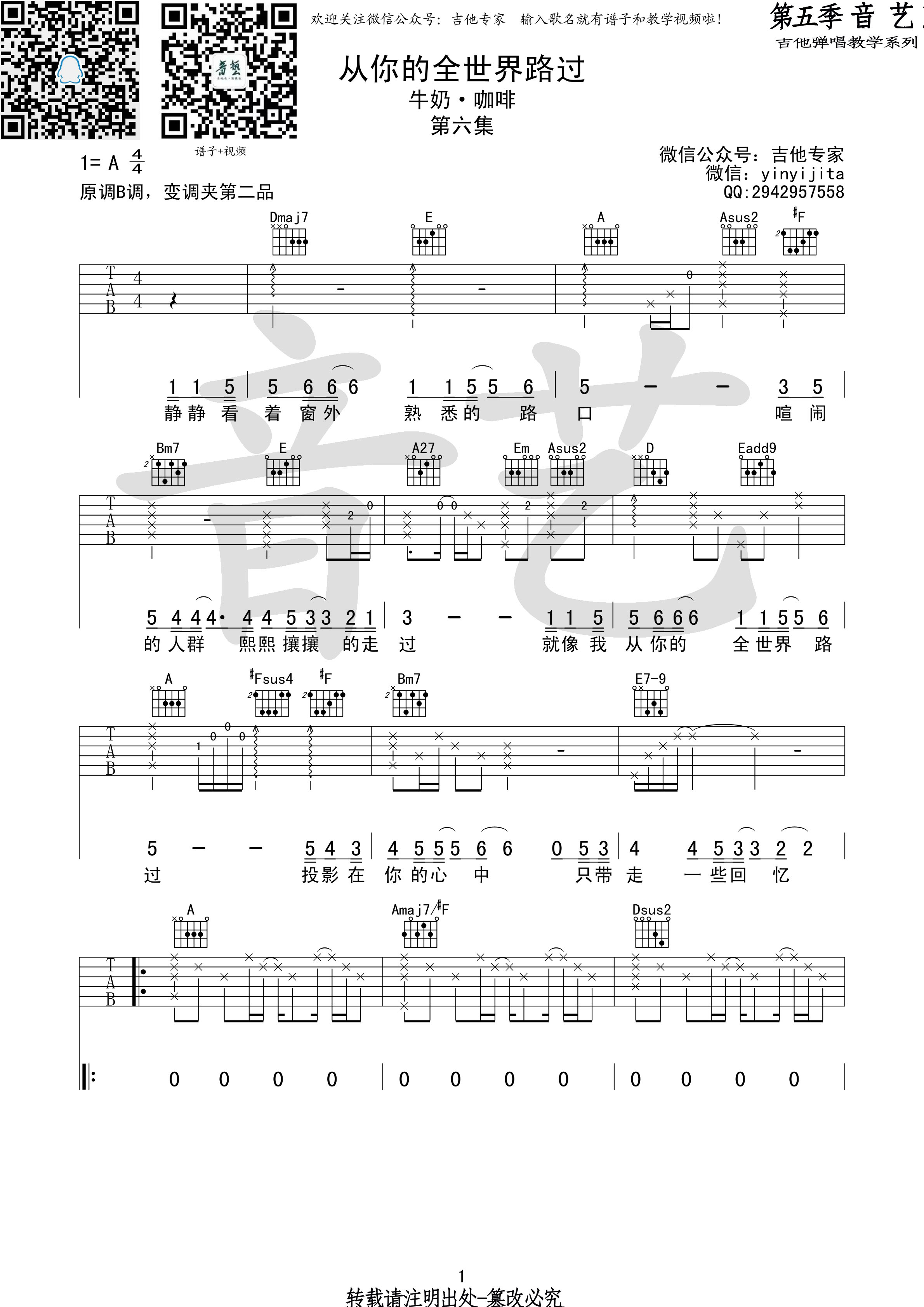 曲谱介绍: 从你的全世界路过吉他谱,高清A调版吉他弹唱六线谱,共四张图片六线谱,来自吉他专家编配。这首歌的原曲和声色彩非常精彩,这里为了方便吉他弹奏(原曲是钢琴伴奏),略有改动,但保留了歌曲的色彩。演奏上和弦用的比较多,而且有些难度,较多的连音线也比较难唱。 牛奶咖啡《从你的全世界路过》,曾经陪你看遍春华秋月,也天真的以为海枯石烂并不是童话。可生命里总有太多阴差阳错,相爱的人最终还是会错过。