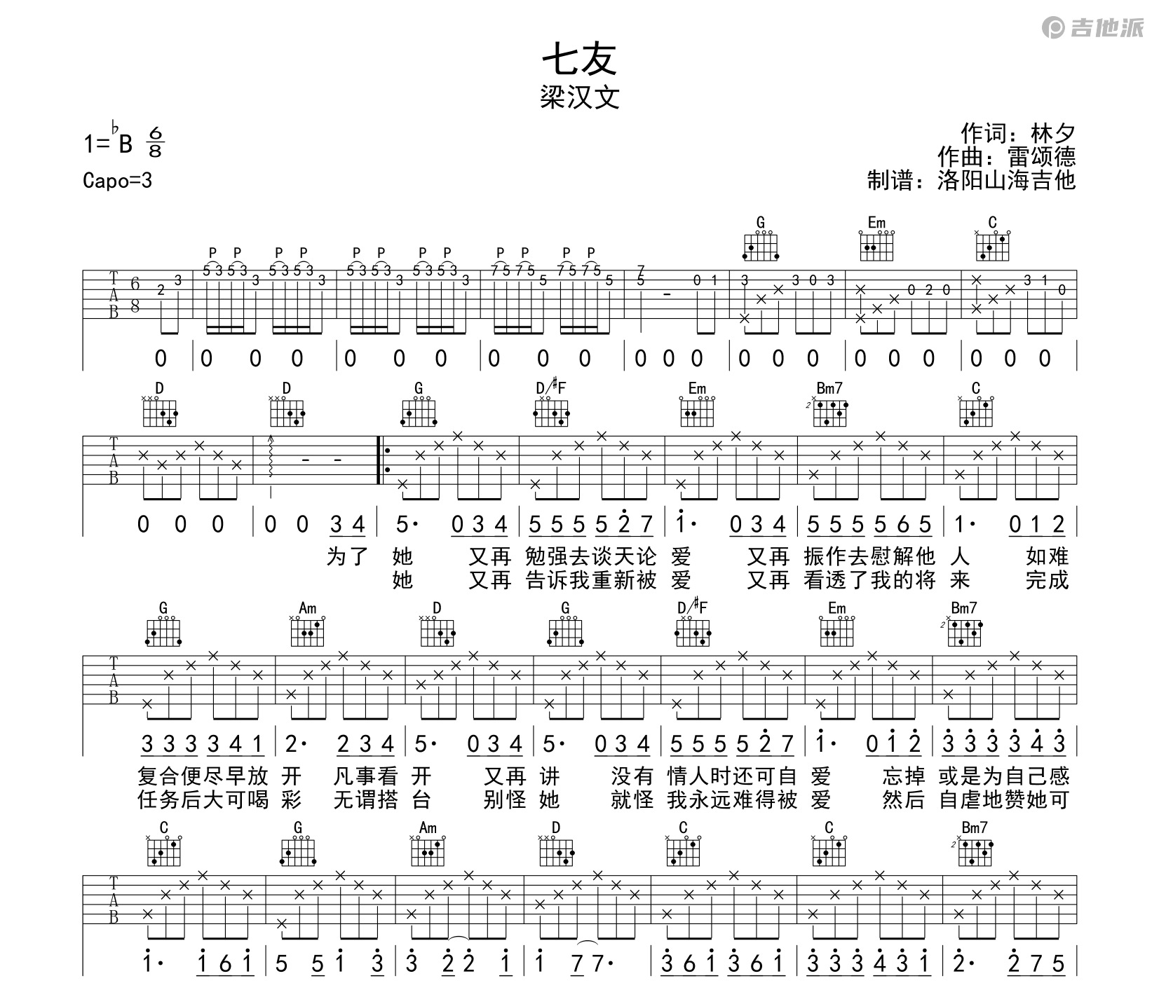 曲谱介绍: 七友吉他谱,梁汉文演唱老歌,来自洛阳山海吉他编配六线谱,共图片六线谱两张,G调指法弹唱伴奏,变调夹夹第三品。演奏的整体难度一般,要注意6/8拍节奏的强弱特点。 男不听七友,女不听钟无艳。梁汉文男备胎之歌《七友》,歌曲将心中爱不得的痛苦转化为对对方的友情,如果不能给你爱情,那就希望能帮助你去找到你想要的爱,也许这才叫真爱。