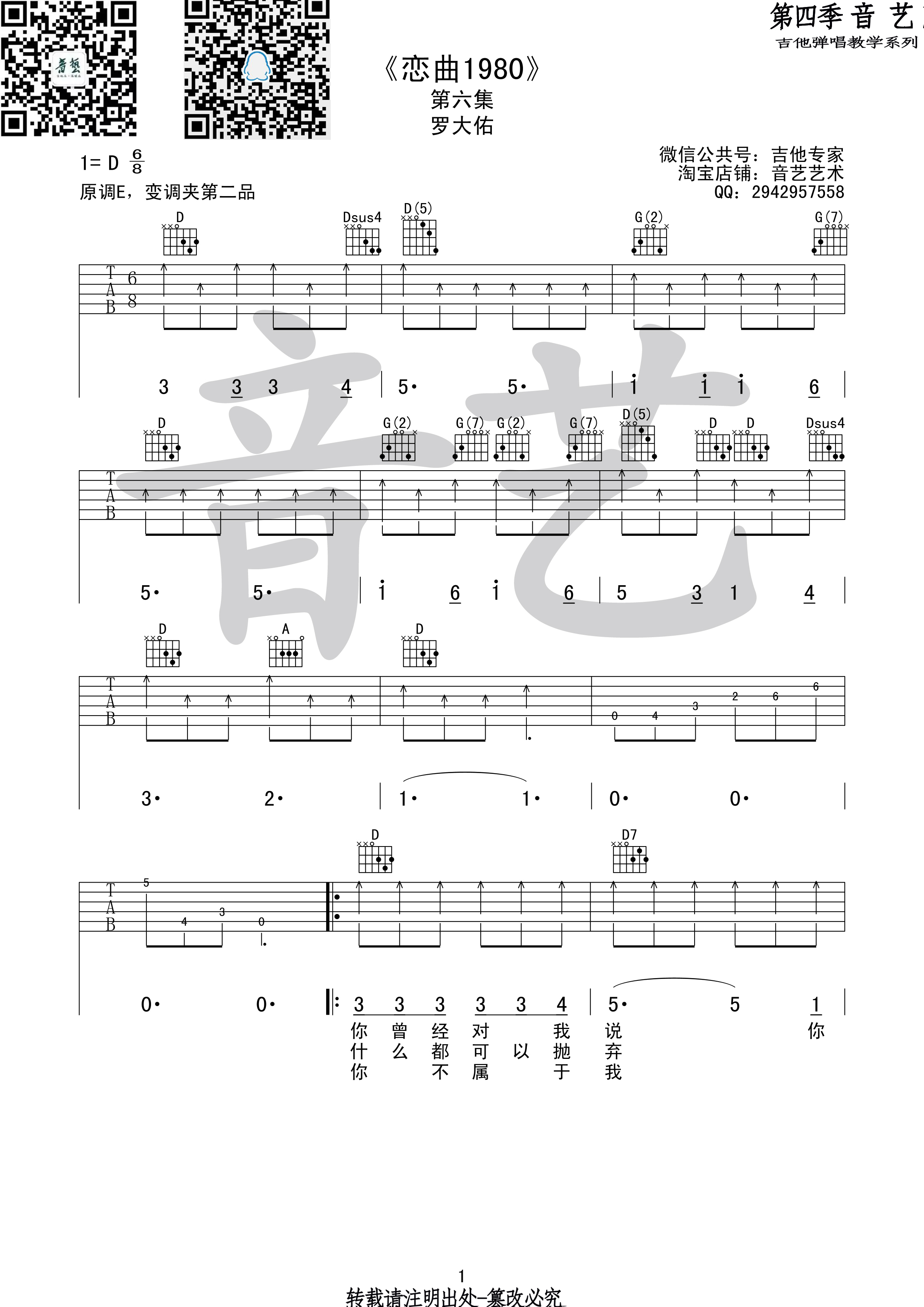 曲谱介绍: 恋曲1990吉他谱分享,罗大佑经典老歌,D调简单版吉他弹唱谱,来自吉他专家编配制谱,共高清谱三张谱例。歌曲节奏比较简单,基本都是八分音符扫弦伴奏,且都是向下的扫弦,没有什么起伏变化。 罗大佑《恋曲1990》,每当这段旋律响起来,封印的记忆好像得到了释放,在愣住的霎那间,记忆翻腾起那一段段旧时光的影像。