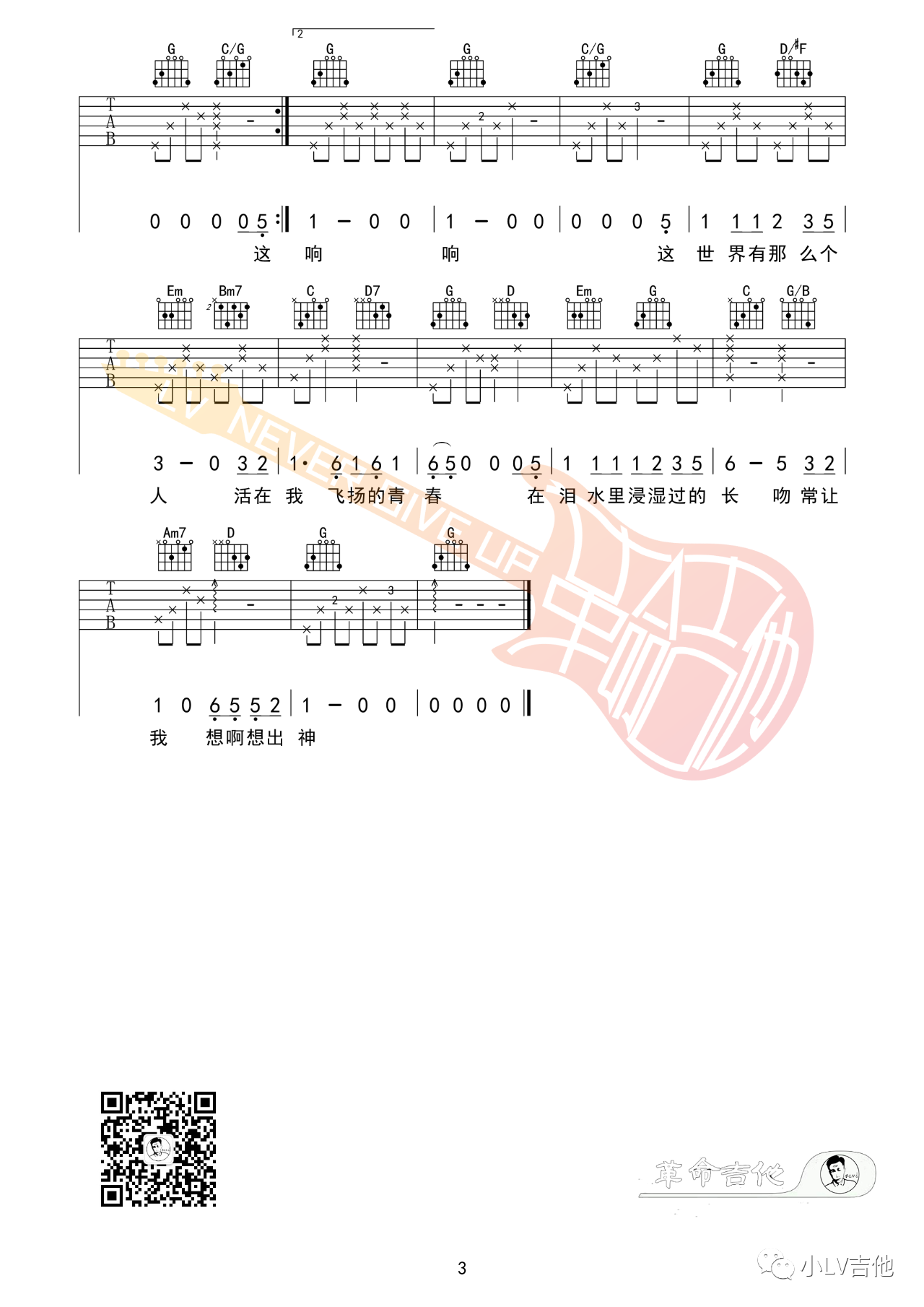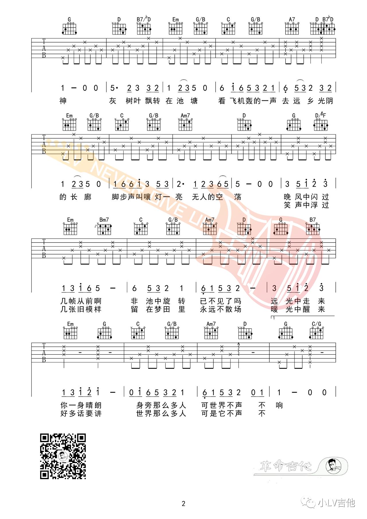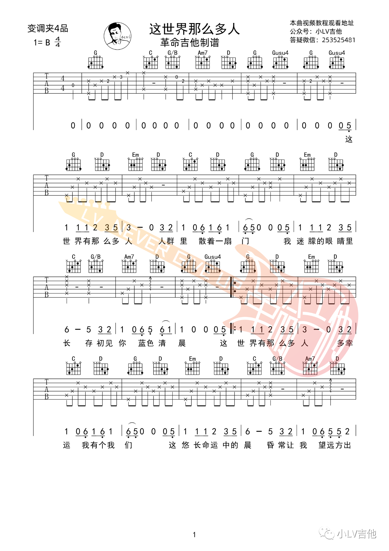 曲谱介绍: 这世界那么多人吉他谱,G调版吉他六线谱,来自革命吉他教室编配,G调简单指法演奏版。这首歌编配的难度较容易,主要练习要点是和弦的准确掌握。莫文蔚《这世界那么多人》,她用温暖的歌声唱尽了恋爱男女拼尽全力对抗现实的辛酸苦楚。即使我们的故事可能不圆满,但庆幸这世界那么多人,还曾经有过我们。