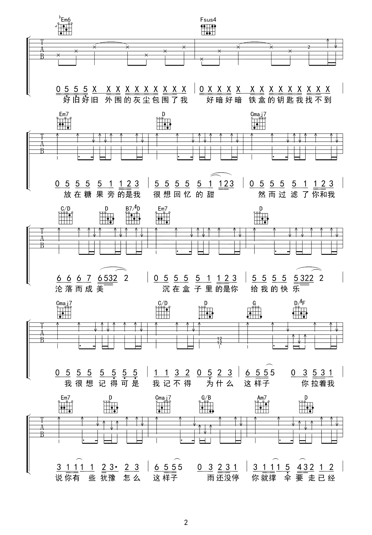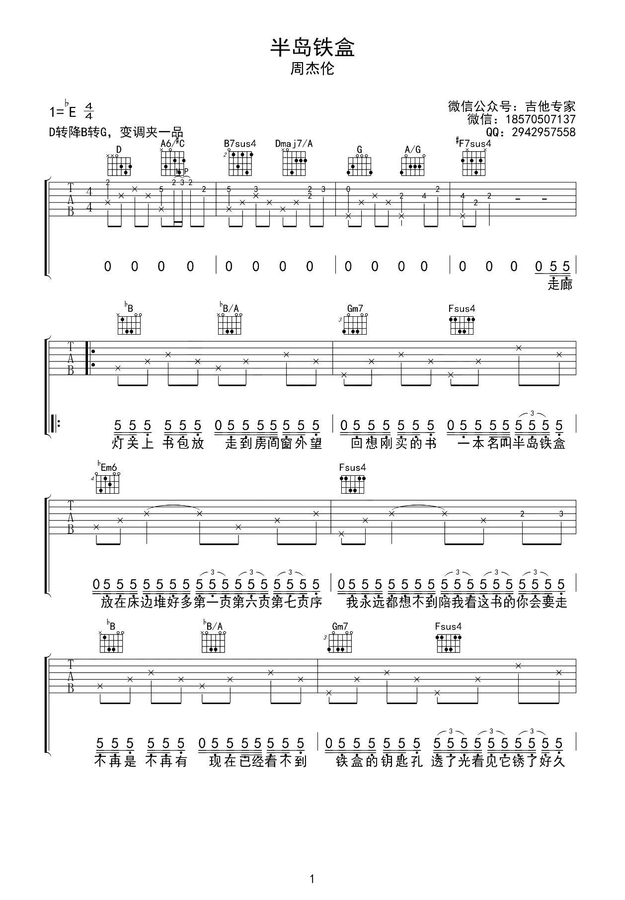 曲谱介绍: 半岛铁盒吉他谱,周杰伦演唱,小姐请问一下,有没卖半岛铁盒。在歌曲中,岁月或深或浅地铭刻着。《半岛铁盒》吉他弹唱谱,原调bE,采用D调转B转G调和弦编配,变调夹夹一品,完整版六线谱共三张图片,感谢@吉他专家编配制谱,琴谱网更新上传。 再听起这首歌,你一定会想起温馨的故事,那些被回忆珍藏的美好,虽然不再有曾经的那种激动与温情,但却依然值得回味,仿佛已变为生命中的一部分。
