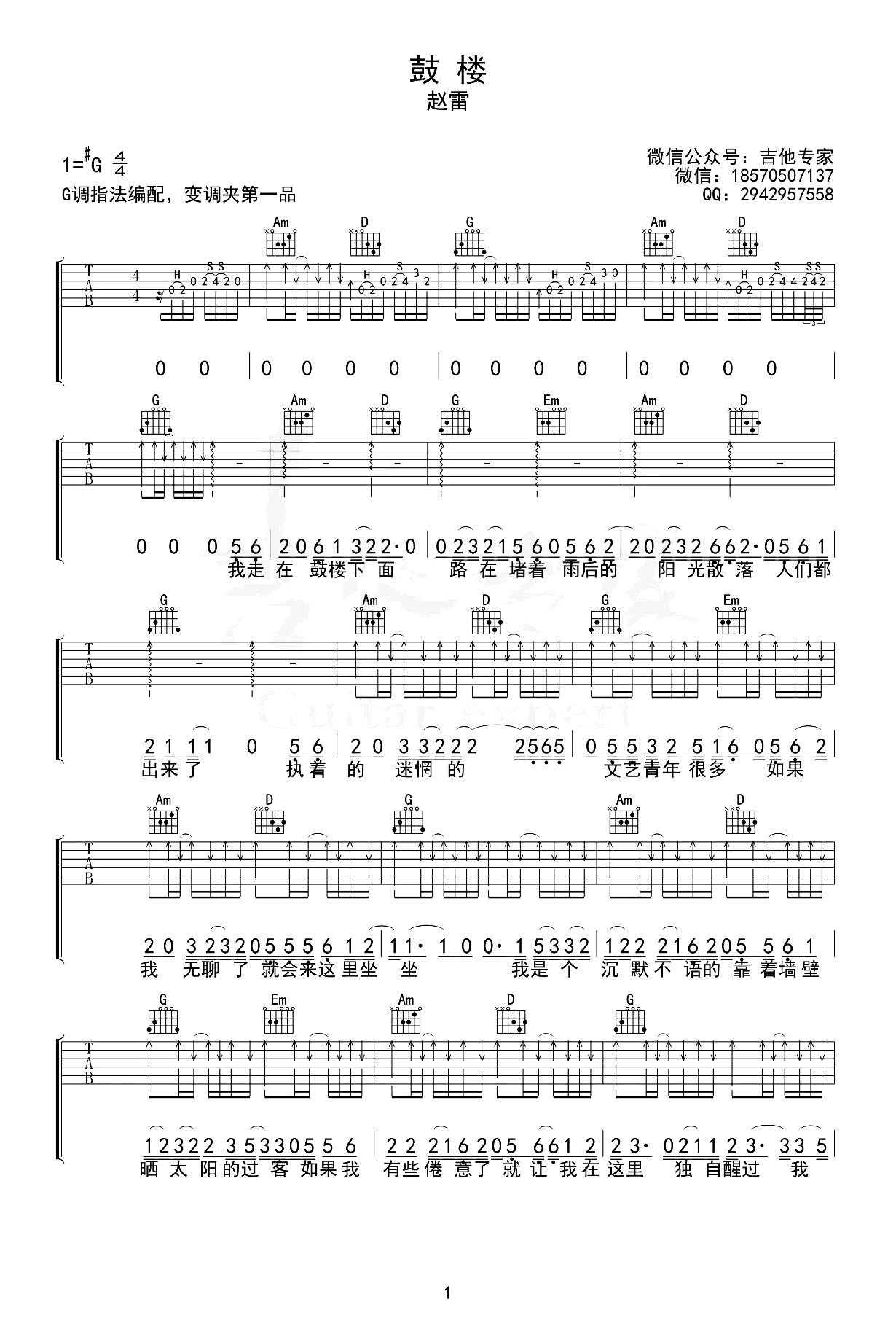 曲谱介绍: 鼓楼吉他谱,赵雷演唱的一首经典民谣歌曲,《鼓楼》吉他弹唱谱,原调为#G调,选用G调和弦,变调夹夹一品,六线谱完整编配共三张图片,感谢吉他专家扒谱出品,琴谱网更新上传。 站在城市鼓楼下,我们皆是过客,靠着墙壁,默不作声。时光如流水,人来人往,岁月穿梭,留下的唯有匆匆过客。生命如此短暂,留下的是我们的足迹,未来与未知,都是我们要探寻的远方。