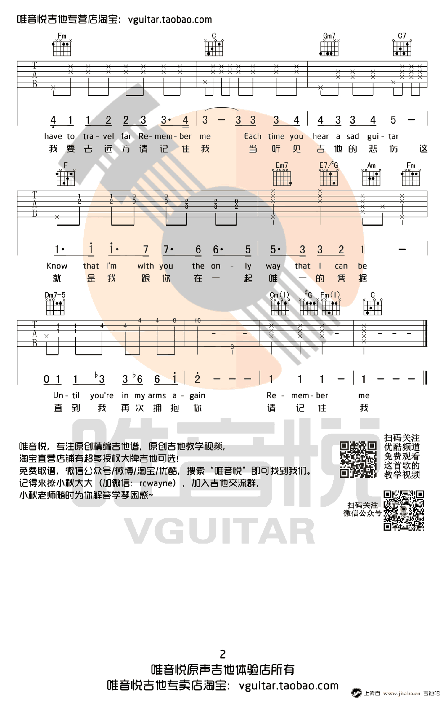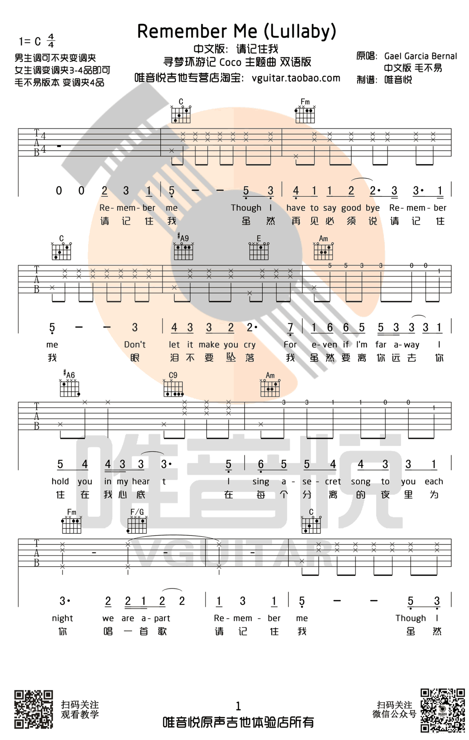 曲谱介绍: rememberme吉他谱,电影《寻梦环游记》主题曲,请记住我吉他谱,C调简单版编配,男生调不用变调夹,女生建议变调夹夹3-4品,毛不易中文版版变调夹夹四品。曲谱为双语版,好看的电影好听的歌,人生总是在寻梦的路上,而家人是比梦想更重要的事情,而在爱的记忆消失前,请记住我!