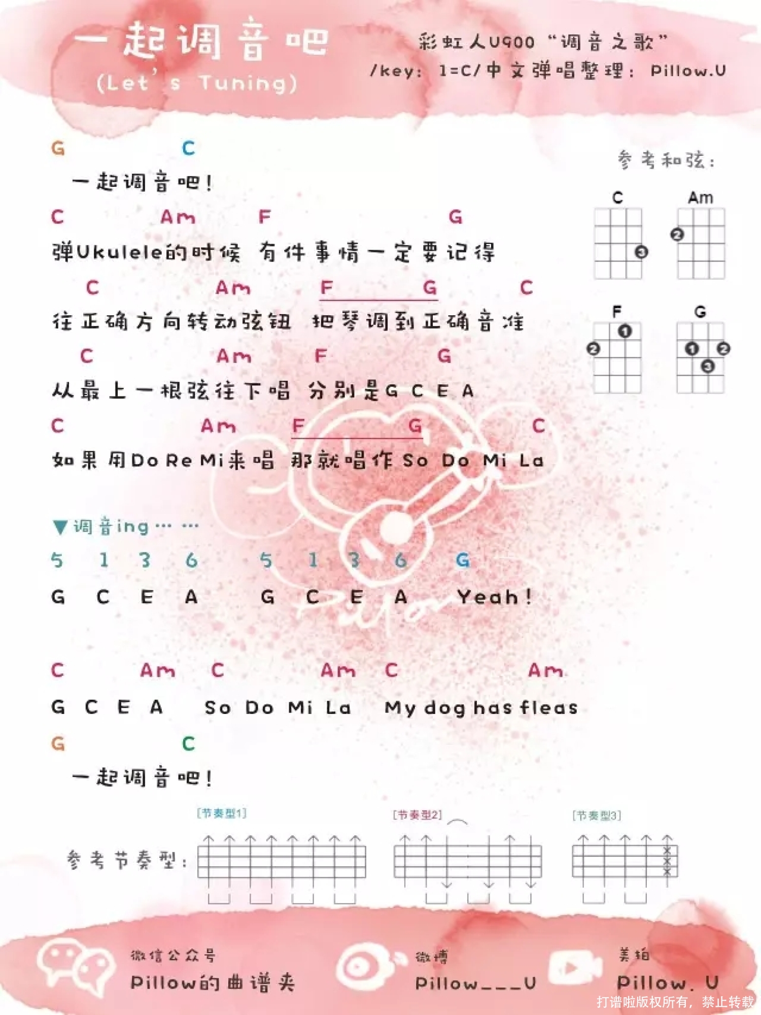 曲谱介绍: 你今天给U调音了吗? 不管有没有… 都来一起唱调音之歌吧!   U900 let's tunung   let's tunung ukulele谱 呐 这首歌来自U900 ▼ 它们是彩虹人(aNueNue)与日本插画家合作, 制作的 { 毛线娃娃团体尤克里里二重奏 } ✔ 左边是熊野 900(クマの 900), 右边是兔野 U(ウサギの U)。 这首原本是日文歌, 我根据官方MV整理了中文谱, 4大和弦就搞掂噢, Yeah!